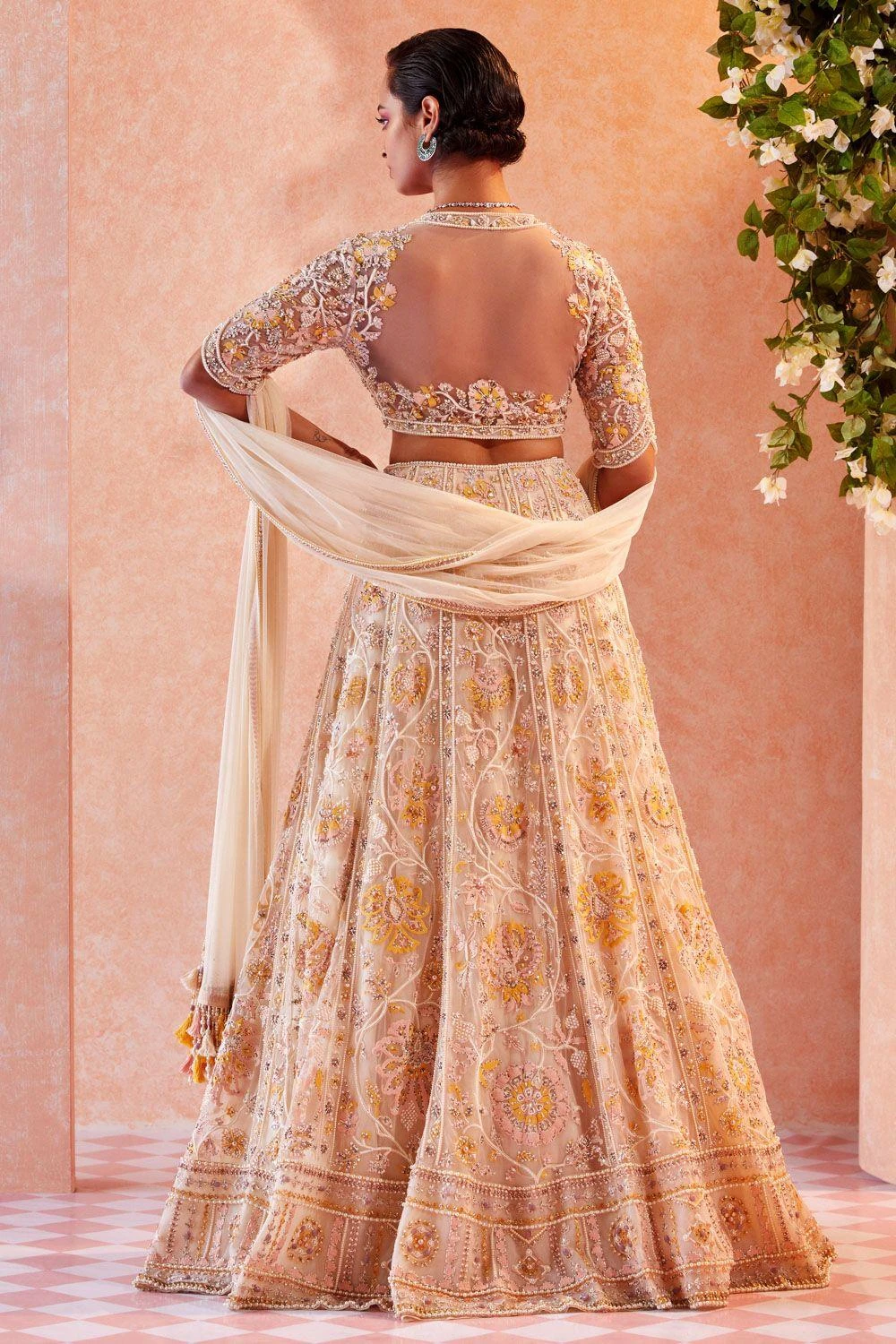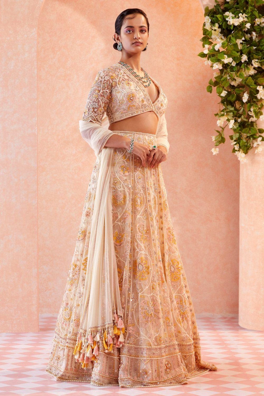Make an ethereal entry in this alluring ivory embellished lehenga set. It features a sultry embroidered blouse paired with an extensively embroidered lehenga & sheer net dupatta. Adorn an emerald necklace with this look for your engagement ceremony.