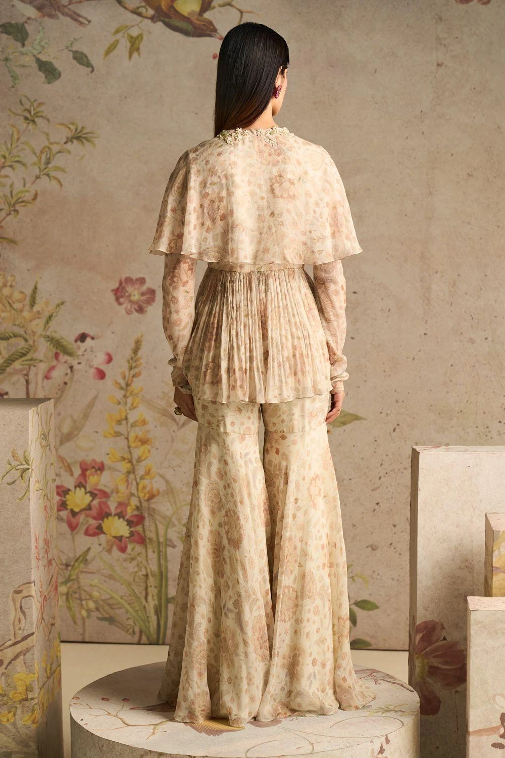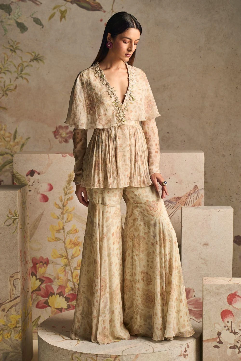 Adorn yourself in grace with this Ivory Printed Chiffon Cape Style Peplum, delicately embroidered and paired seamlessly with a Chiffon Gharara. An epitome of timeless sophistication.