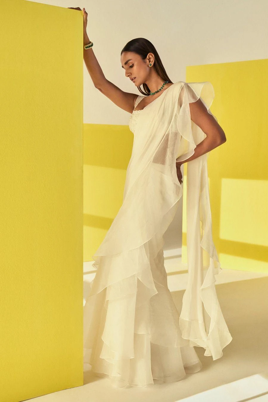 Elevate your traditional wardrobe with this stunning ivory sari set. The blouse features intricate pearl embroidery on the sleeves while the sari is draped with cascading ruffles for a dramatic effect.
