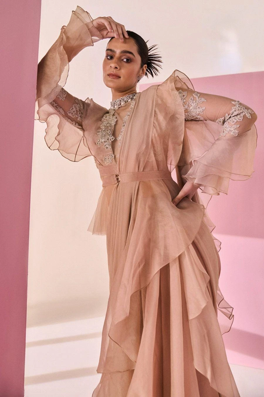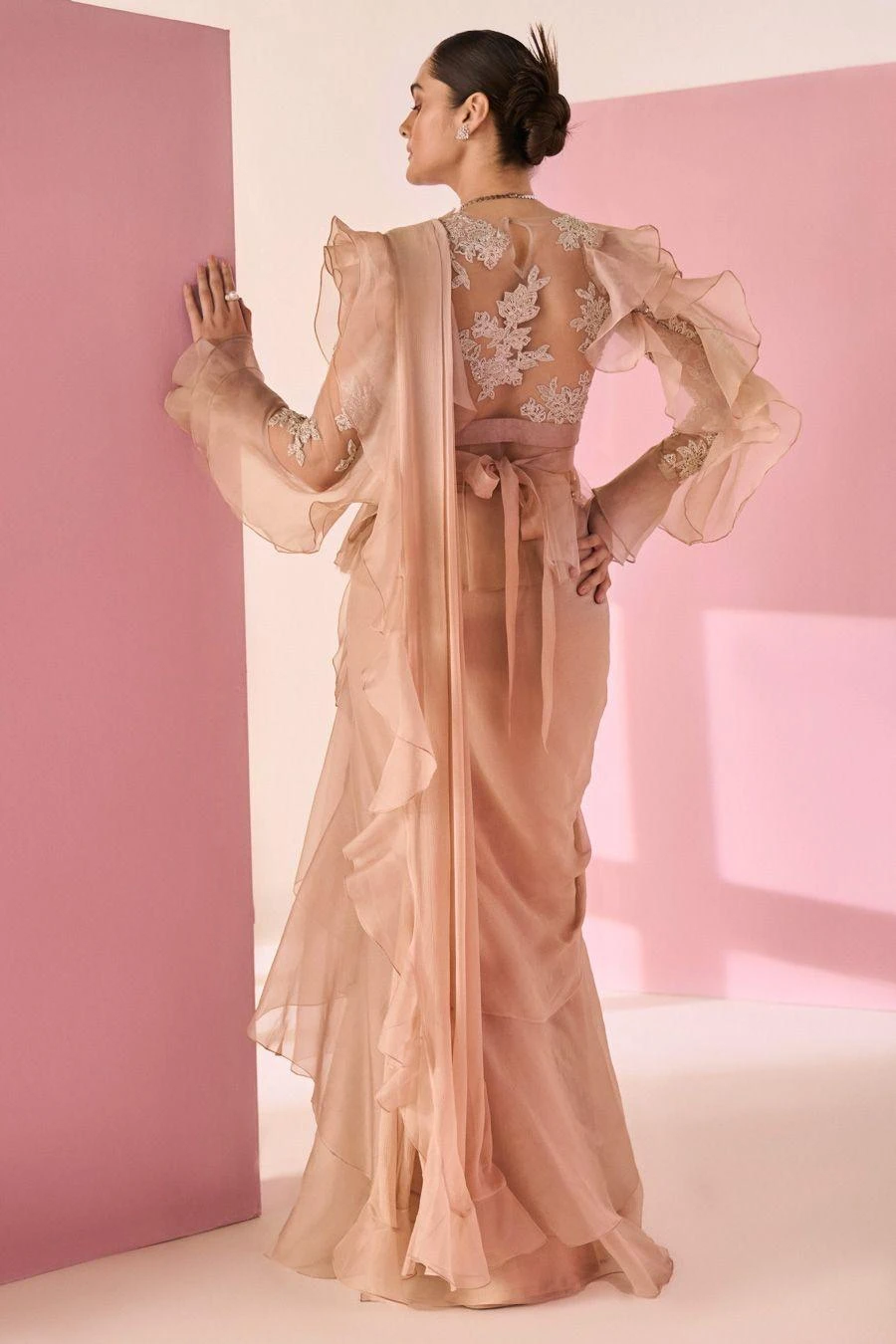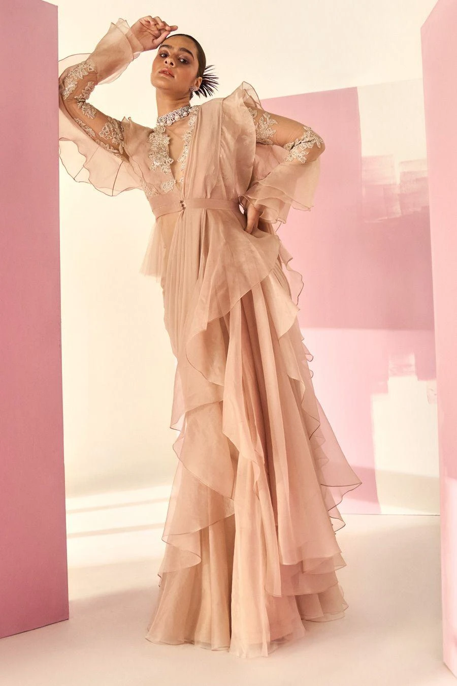Elevate your traditional wardrobe with this stunning champagne sari set. The blouse features intricate embroidery on the sleeves while the sari is draped with cascading ruffles for a dramatic effect.