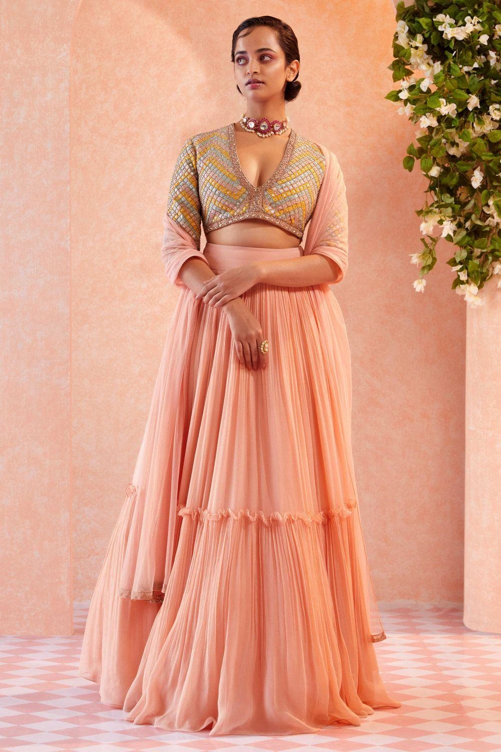 Attend your next intimate destination wedding in this elegant peach lehenga set. It features a sultry V neck embroidered blouse woven in net, paired with two tier chiffon lehenga & net dupatta. Adorn a jadau choker with this look.