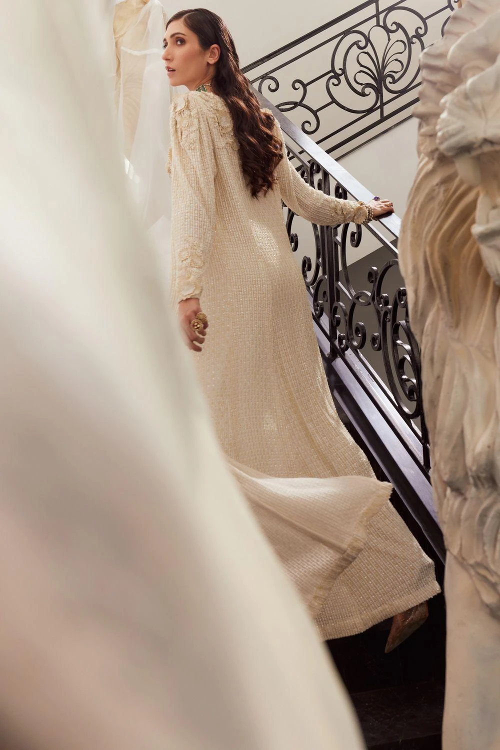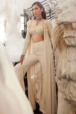 Elevate your style with this resplendent ivory jacket adorned with intricate floral motifs and hand thread work. Paired with a 3D floral bralette and bell bottom pants, this ensemble exudes timeless charm and sophistication.