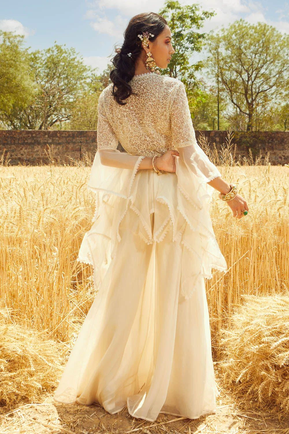 Finely crafted with meticulous details, this ivory sharara set will make you look your whimsical best. It features a tulle ruffled short tunic embellished with intricate pearl work. It is paired with a pair of sharara pants.