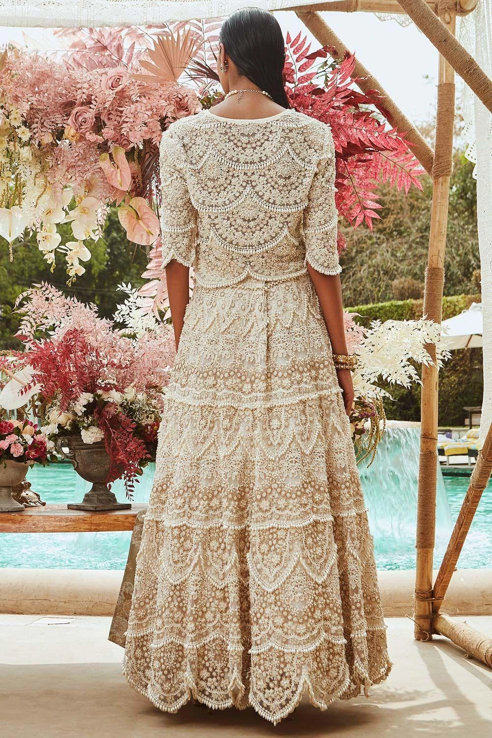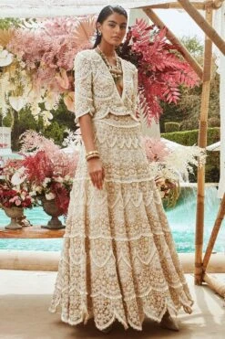 The timeless colour palette infused with contemporary design sensibilities makes this ensemble a perfect choice for the new age bride. It features a fish scalloped drop pearl embroidered lehenga, paired with a matching blouse and a short jacket.