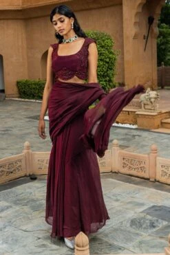 Uncomplicated & fuss-free, this plum concept sari set is a great pick for a reception. Crafted in chiffon, this set features a pre-draped sari paired with a scallop embroidered blouse. Add a pair of statement earrings to complete the look.