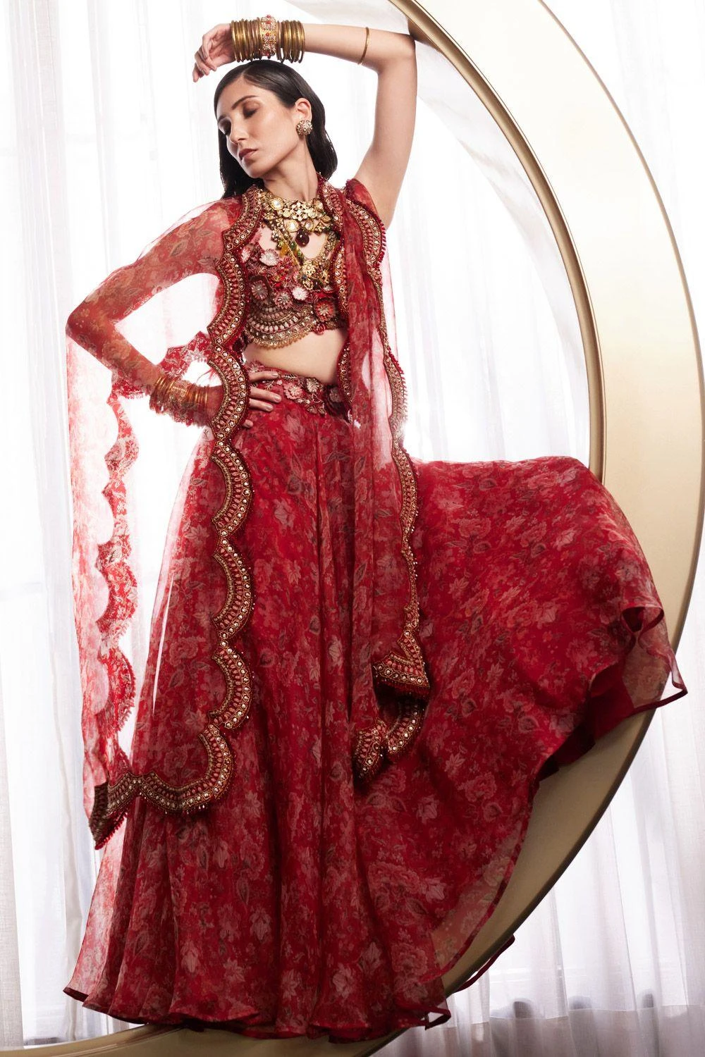 Step into timeless elegance with this jeweled blouse featuring exquisite 3D floral embroidery. Paired with a printed organza flowy skirt and an elegant scalloped embellished printed dupatta, This set is perfect for daytime wedding festivities.