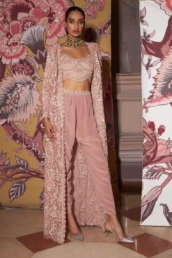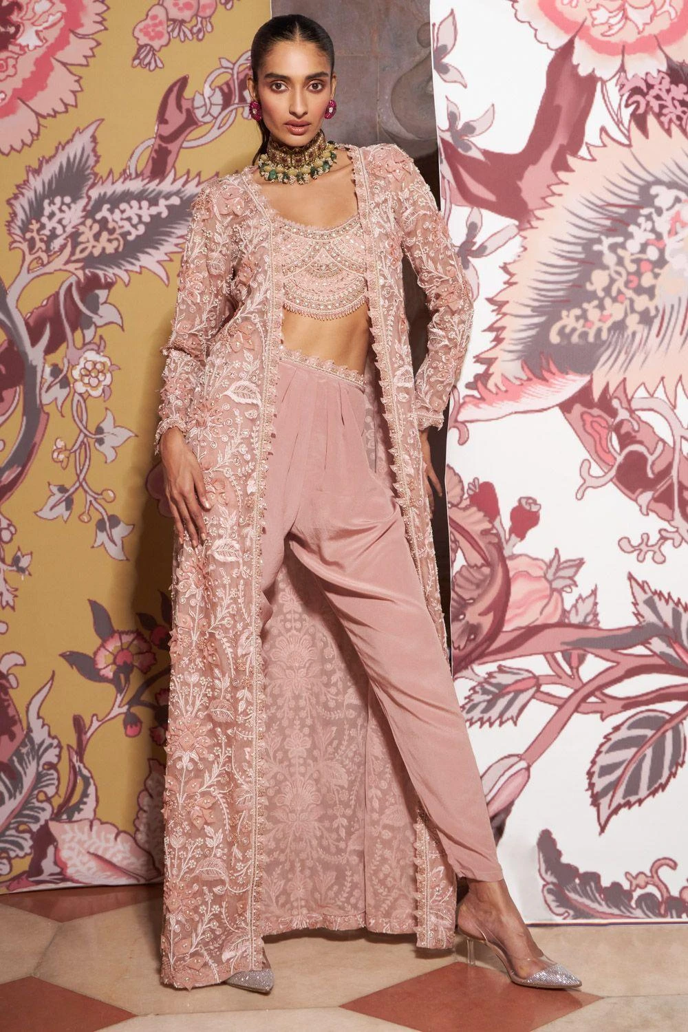 Radiate charm with this pink organza jacket with delicate scallop border detail, paired with a signature bustier featuring pearl drops & coordinated pants. Ideal for chic gatherings & events, this ensemble defines grace & makes a striking statement.