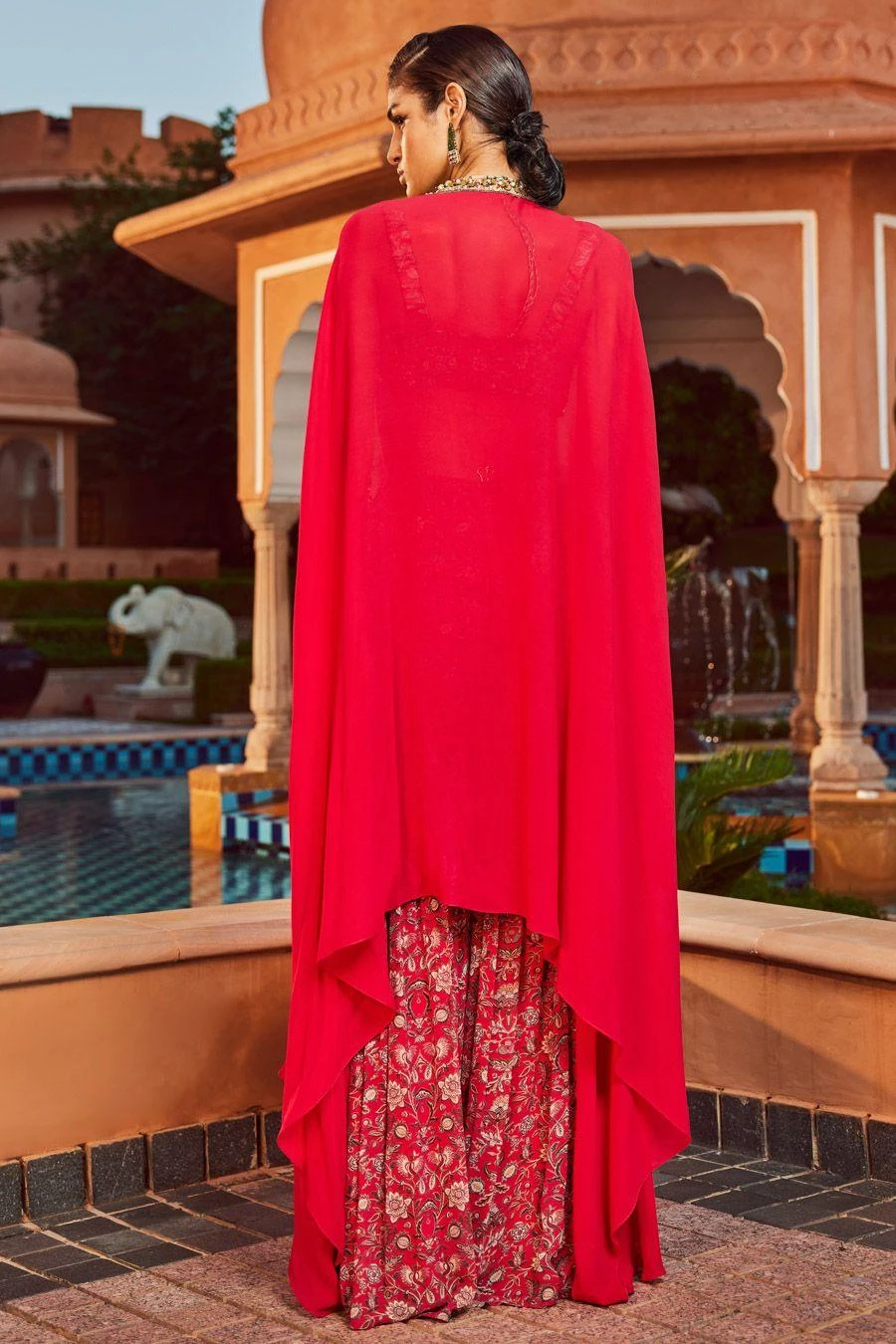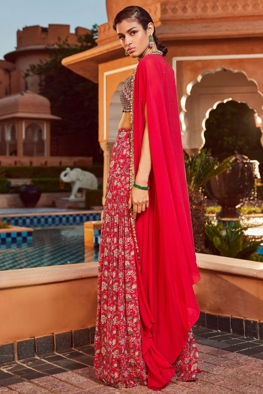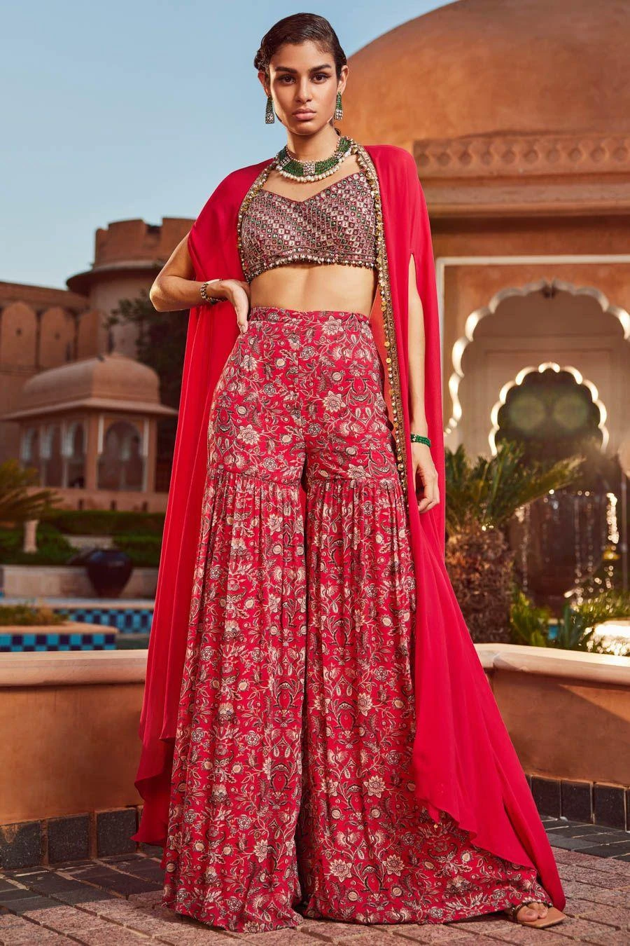 Swap your dupattas for capes this wedding season. Crafted in chiffon & georgette, this set features an embellished solid pink cape paired with a printed sharara and an embellished bralette. Add a pair of statement earrings to complete the look.
