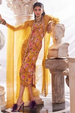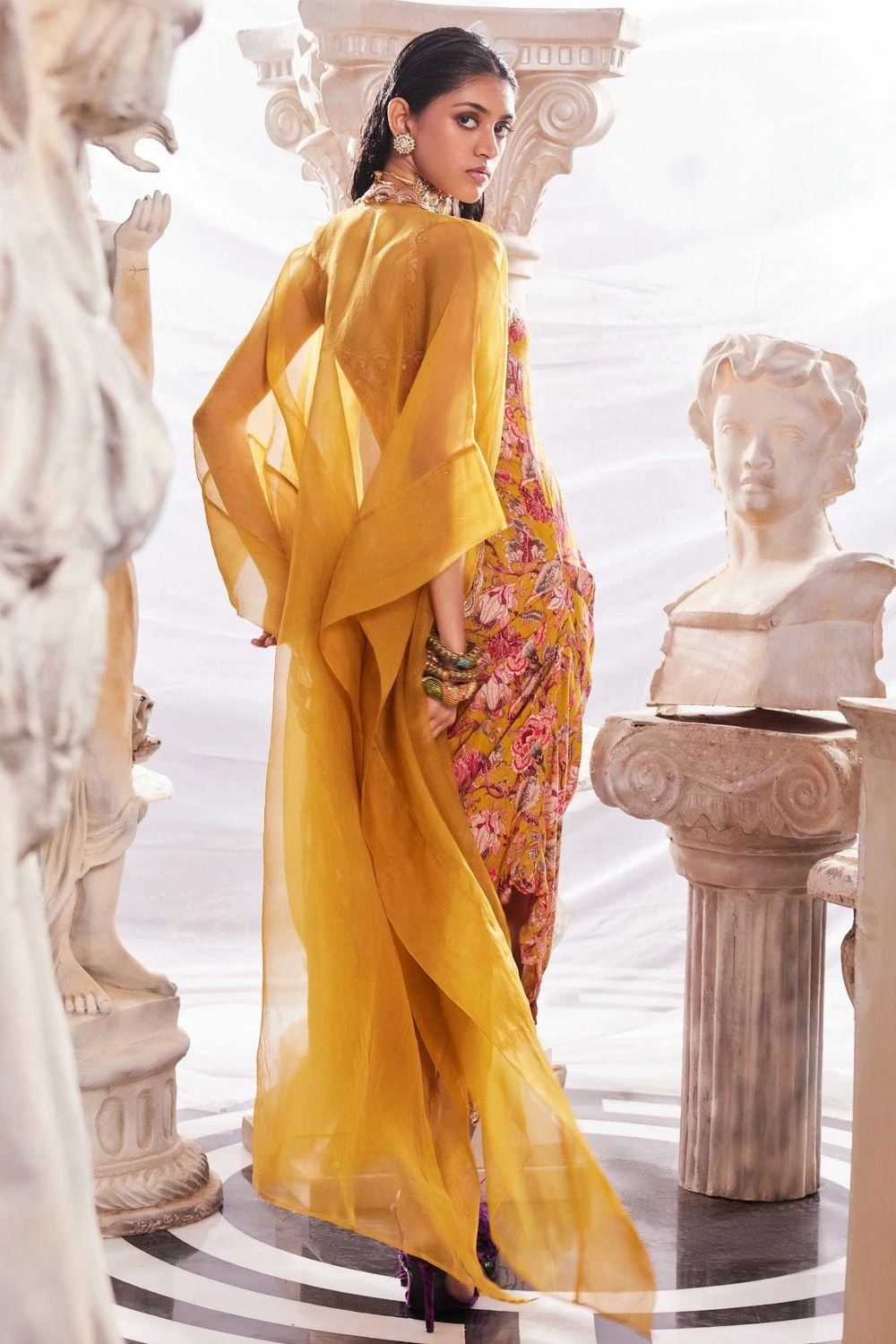 Step into sunny elegance with this yellow printed dress adorned with delicate scallop borders. Complement your look with a long organza cape, creating a captivating ensemble for any occasion.