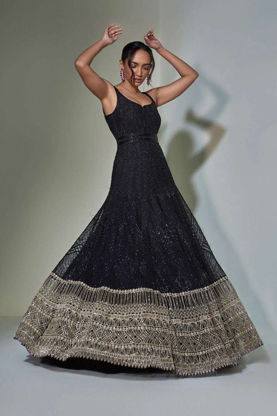 For your wedding adjacent celebrations or festive occasions, this black anarkali set is a great option for a relevant yet rooted look. It features a resham and thread embroidered anarkali, paired with a dupatta and a velcro belt.