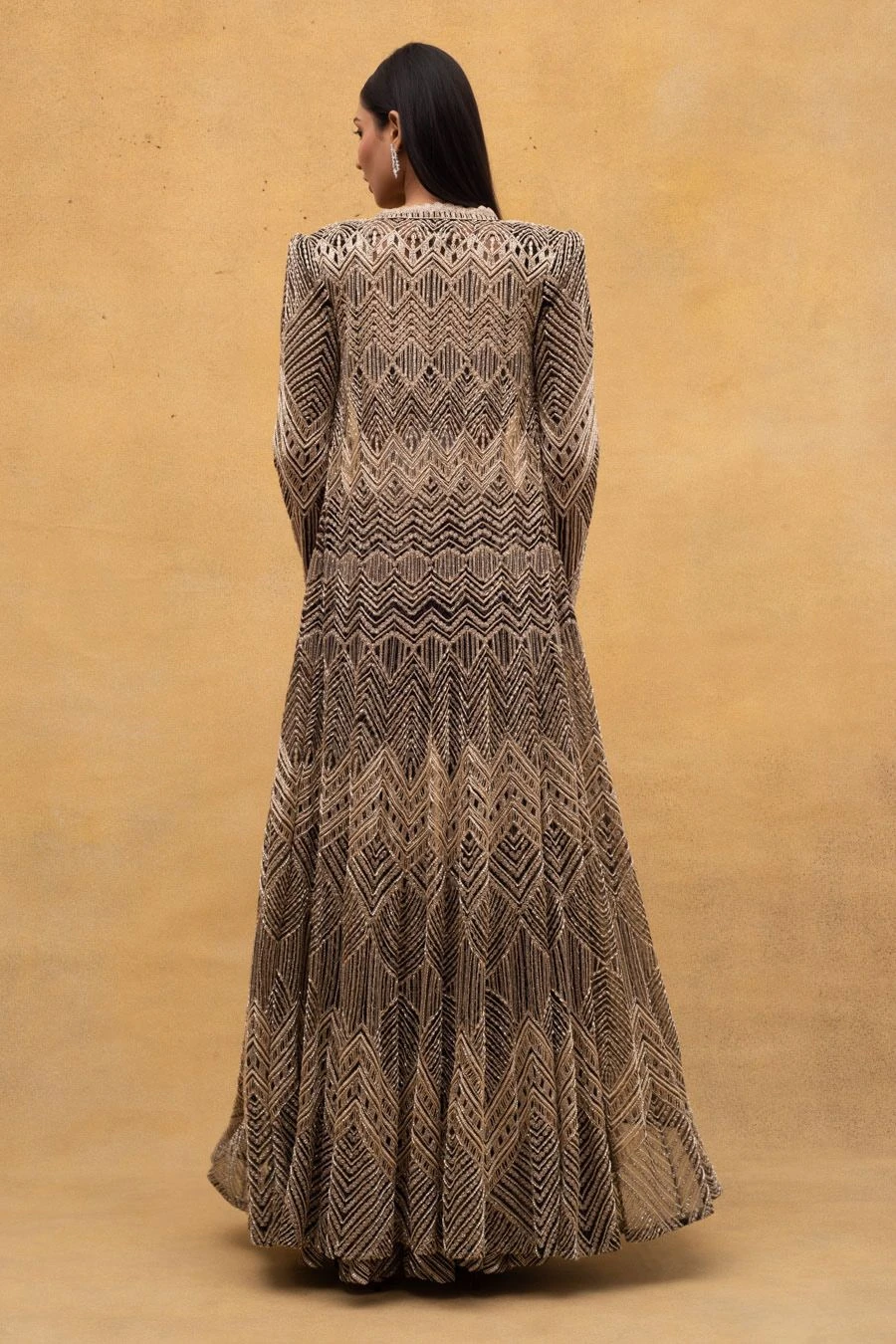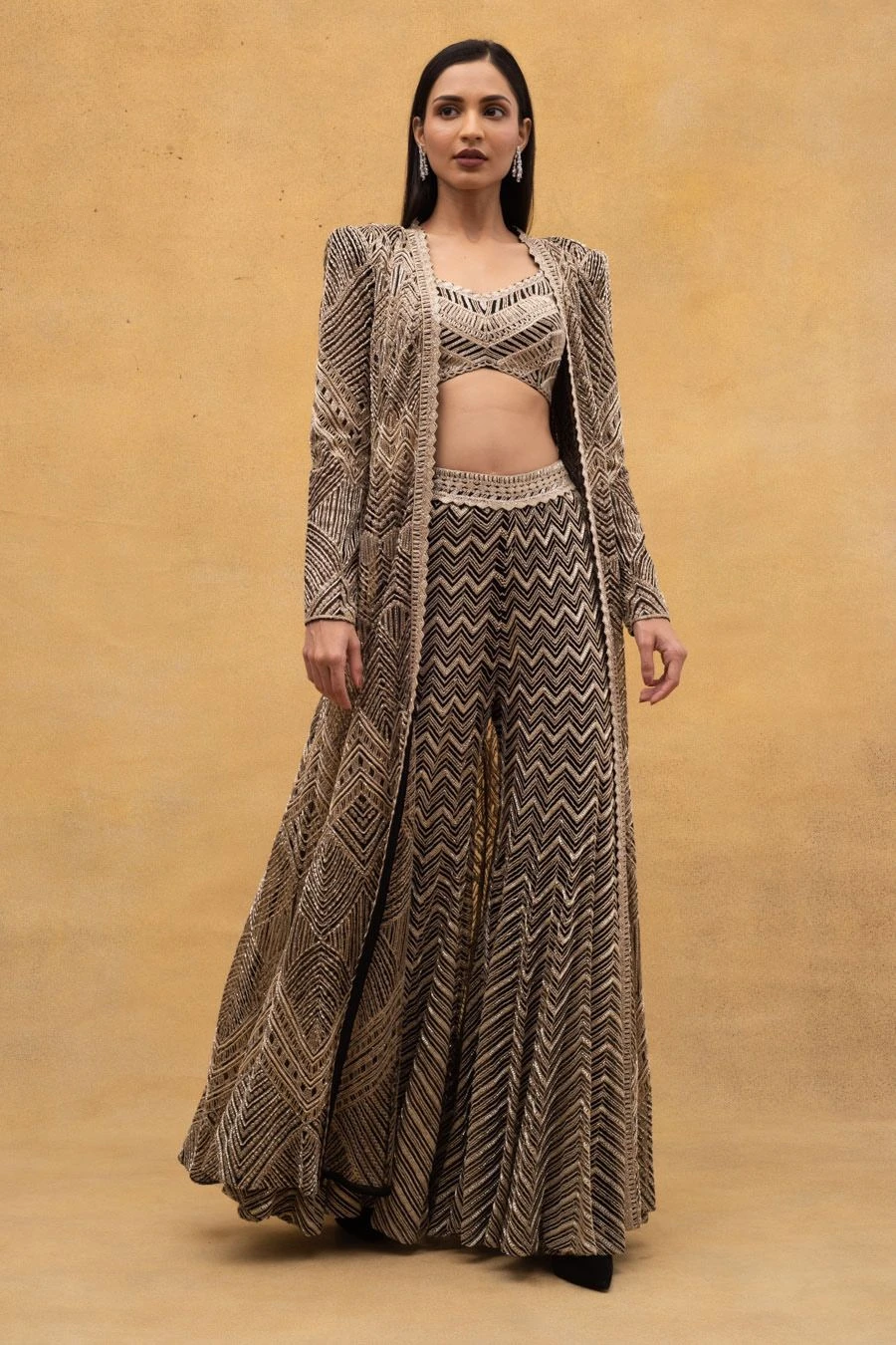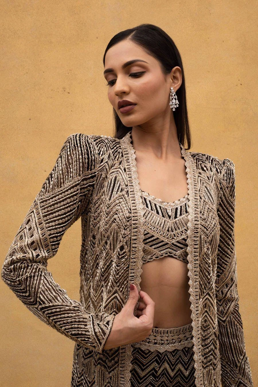 With its contemporary embroidery details and black & gold hues, this jacket set is a must-have during the festive season. It features a net based black hand embroidered jacket, paired with a bustier, sharara pants.