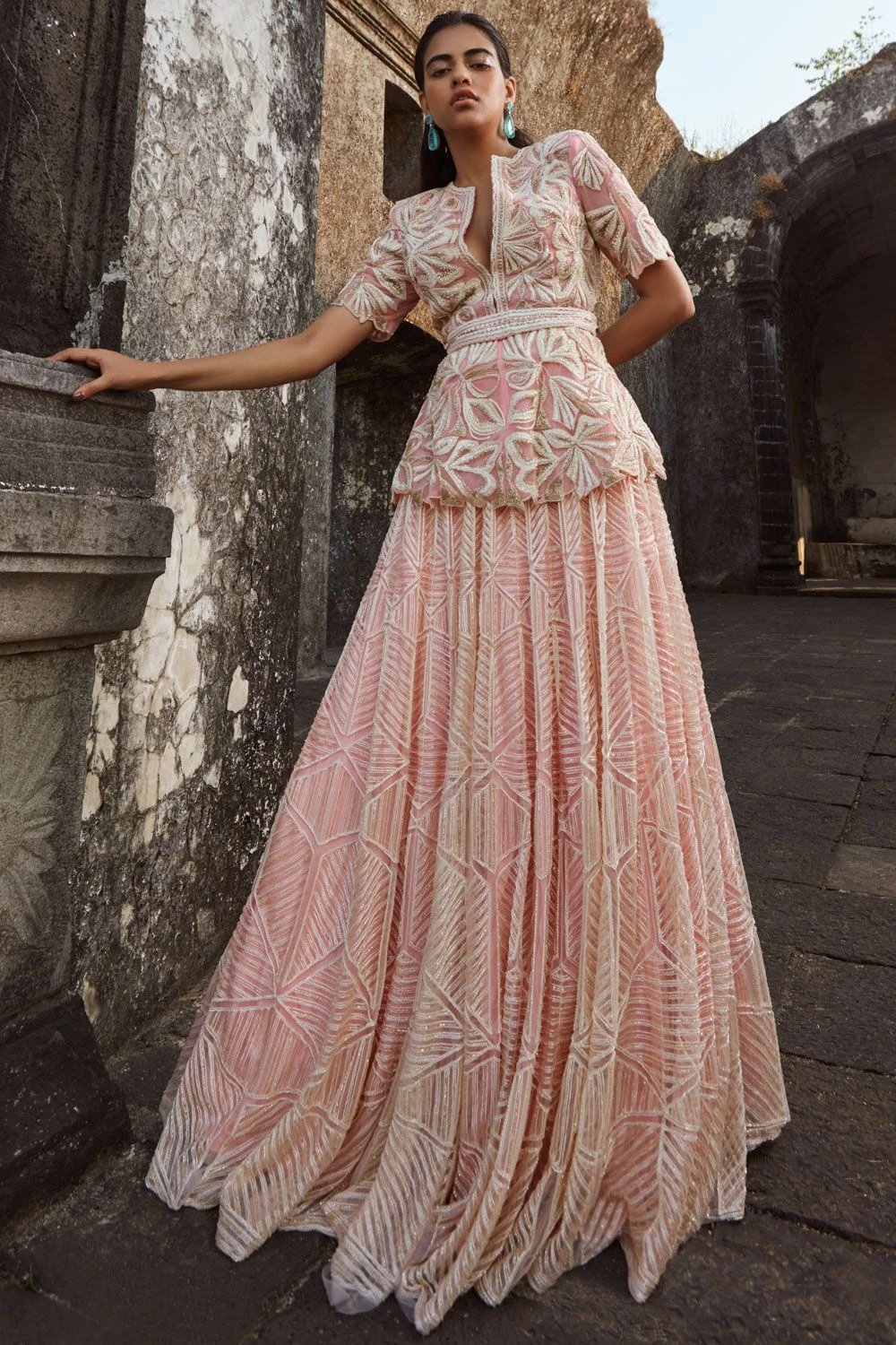 This elegant pink floral embroidered lehenga set has a peplum style blouse with a belt & a breezy lehenga. Style this ethereal set for a daytime engagement with statement earrings & a clutch.