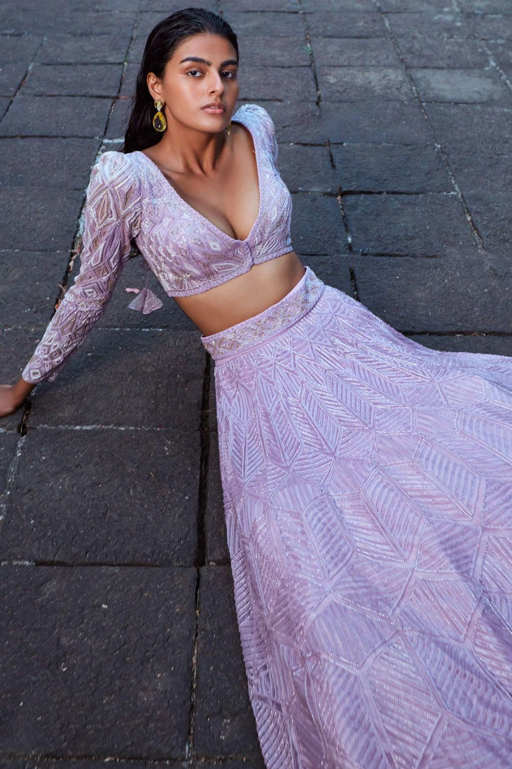 This elegant lavender hand embroidered lehenga set comes with a fully embroidered full sleeved blouse. The statement shoulder & V neck adds a modern element to the lehenga. Style this set with chandbalis for a sangeet.