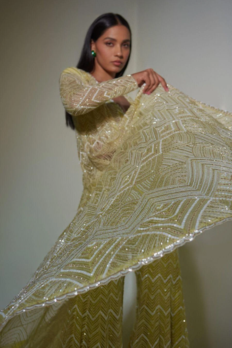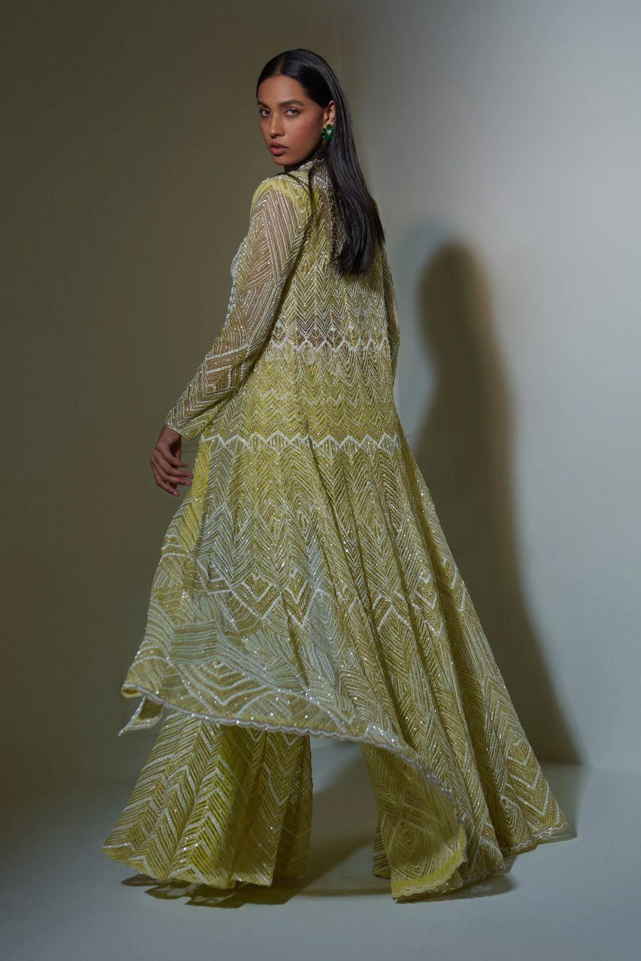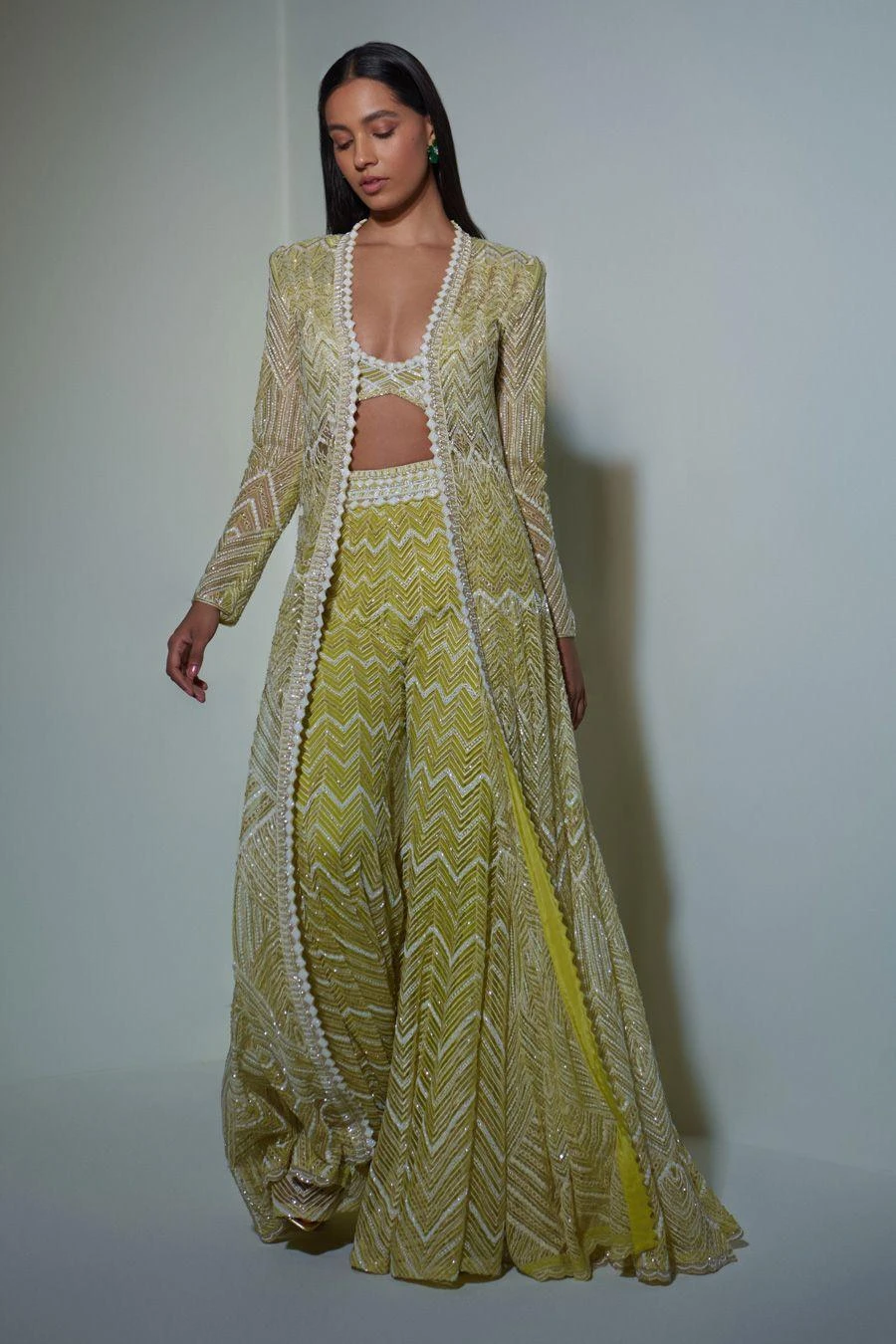 With its contemporary embroidery details and lime green hues, this jacket set is a must-have during the festive season. It features a net based green & gold hand embroidered jacket, paired with a bustier, sharara pants.