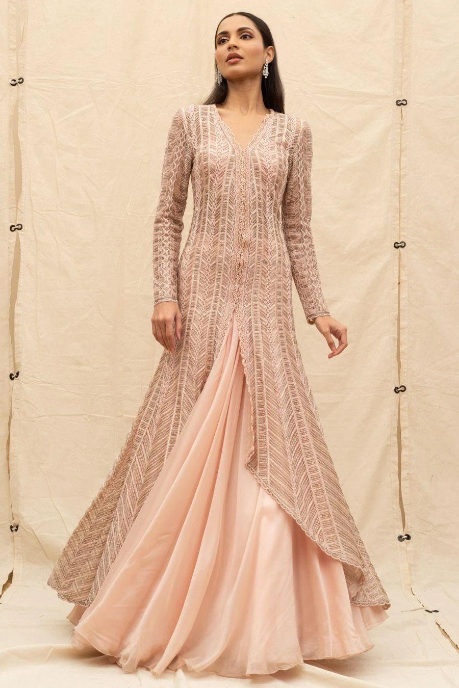 The eye-catching hues and intricate embroidery make this lehenga set the perfect wedding outfit. This set comes with an embroidered, asymmetric jacket paired with a pleated lehenga. Accessorize this set with a pair of statement earrings & a clutch.