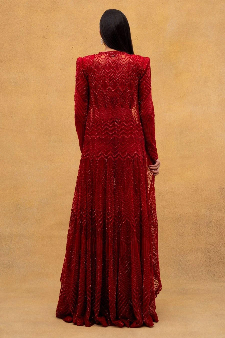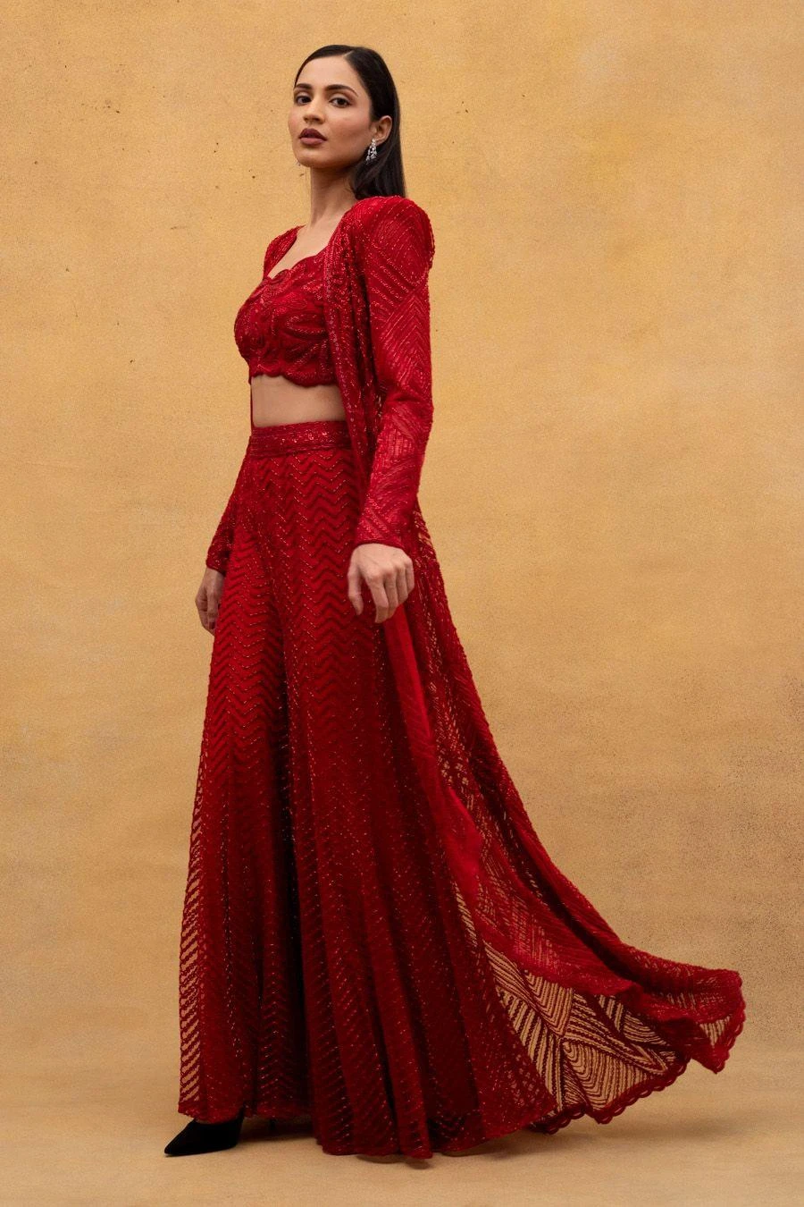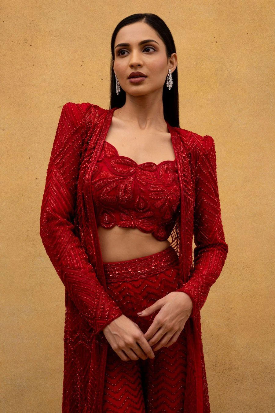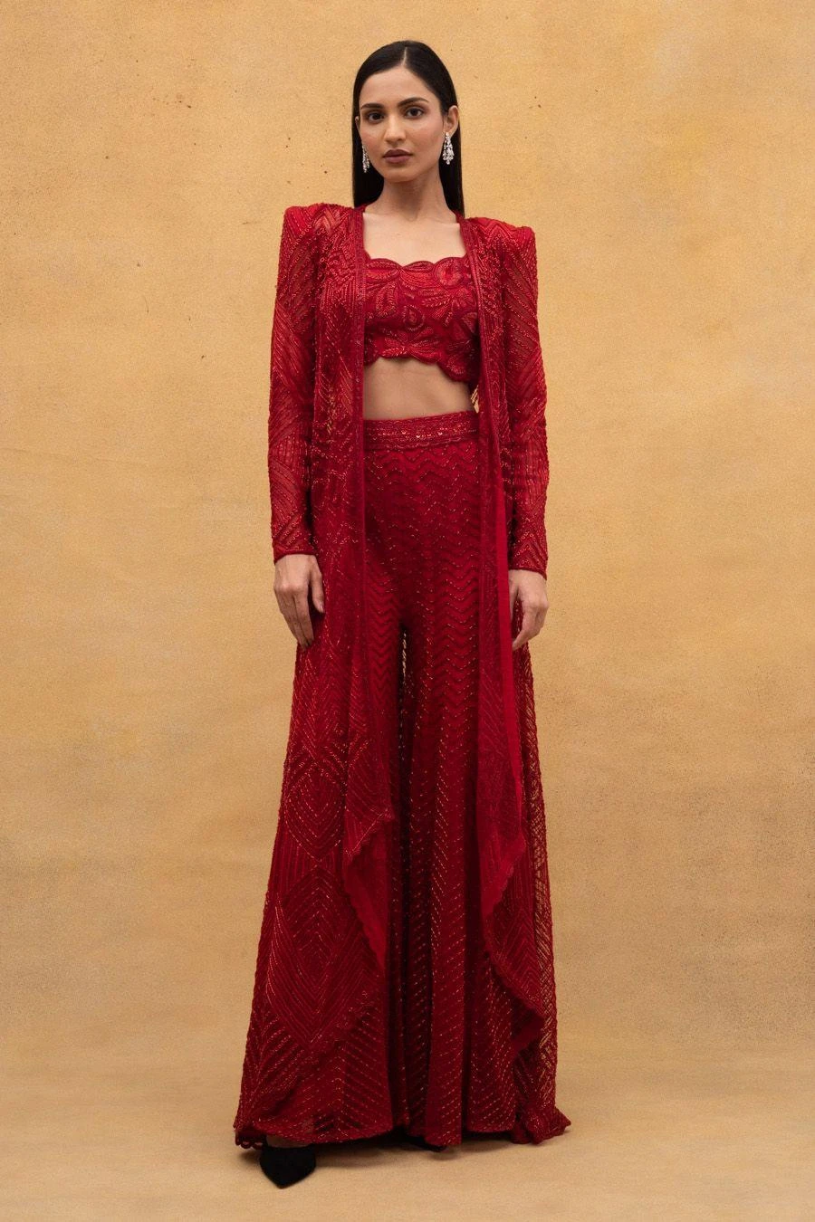 With its contemporary embroidery details and red hues, this jacket set is a must-have during the festive season. It features a net based hand embroidered jacket, paired with a bustier, sharara pants.