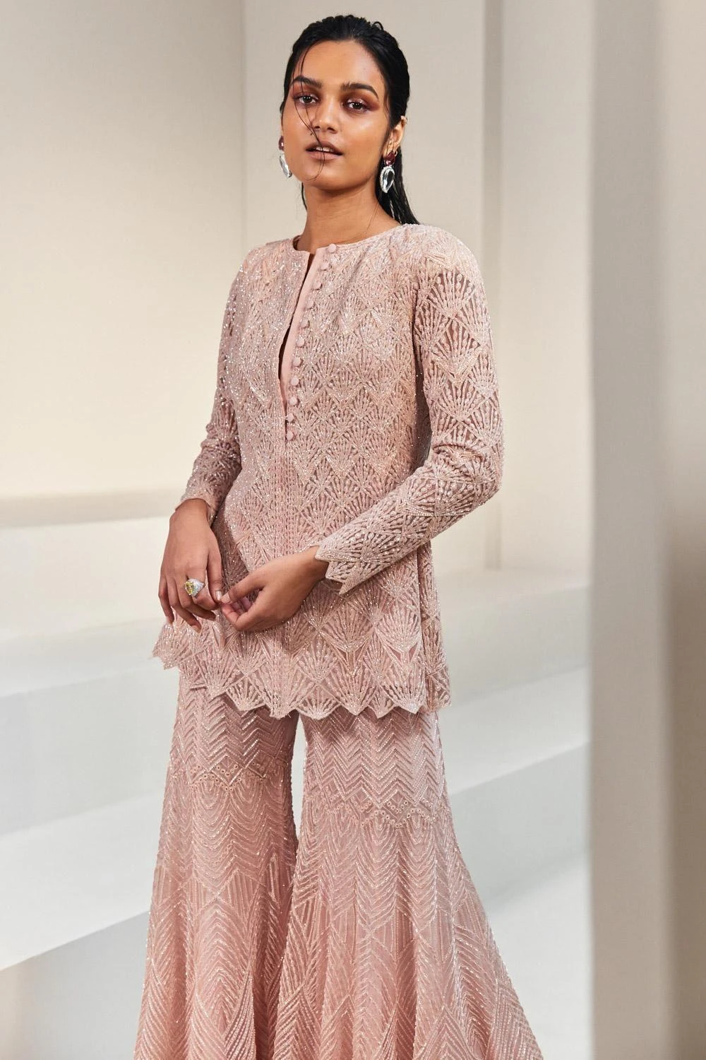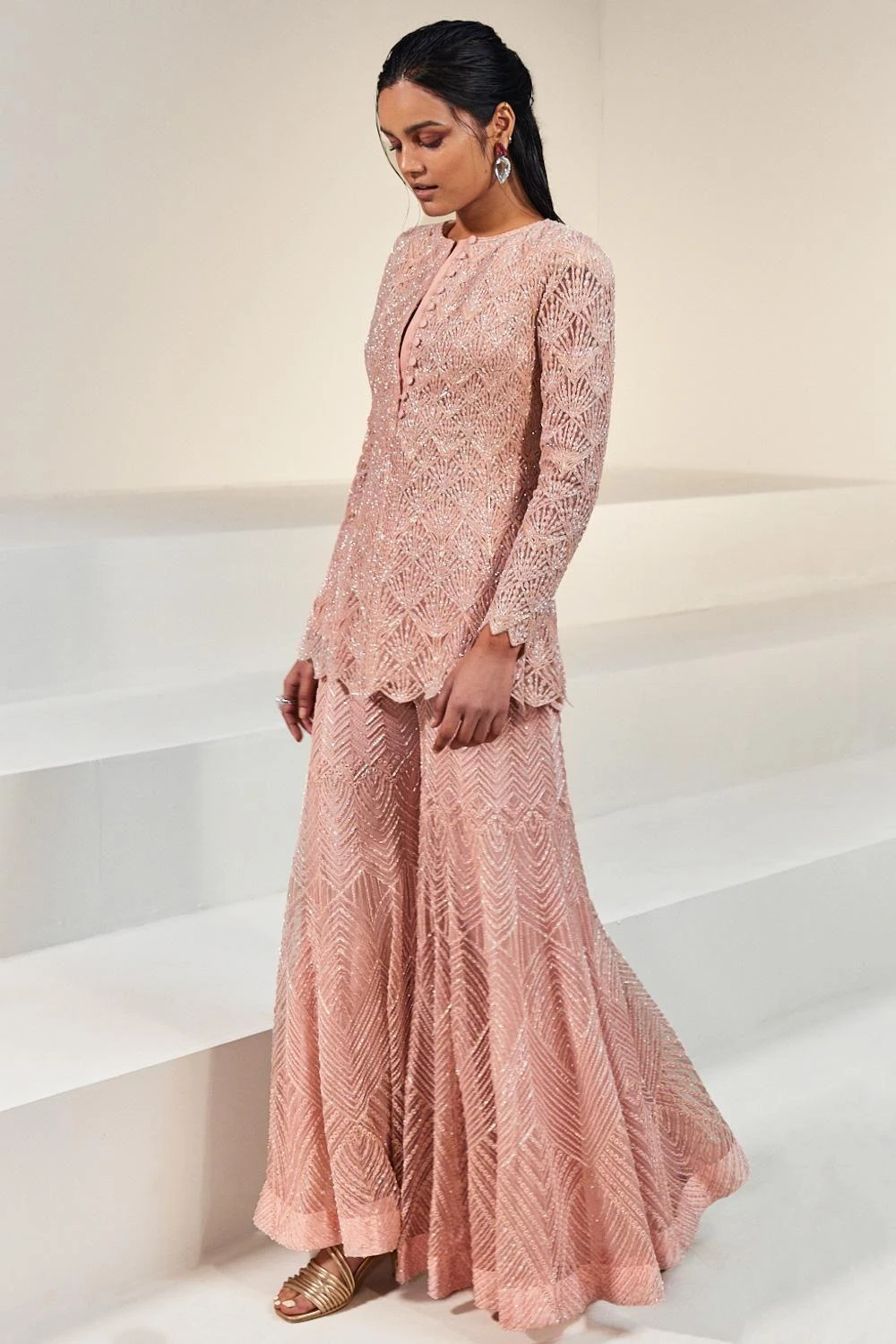 Spruce up your festive closet with a summer apt rose pink sharara set. It features a short, peplum kurta with hand embroidery, paired with a matching pair of sharara pants and an embellished belt.