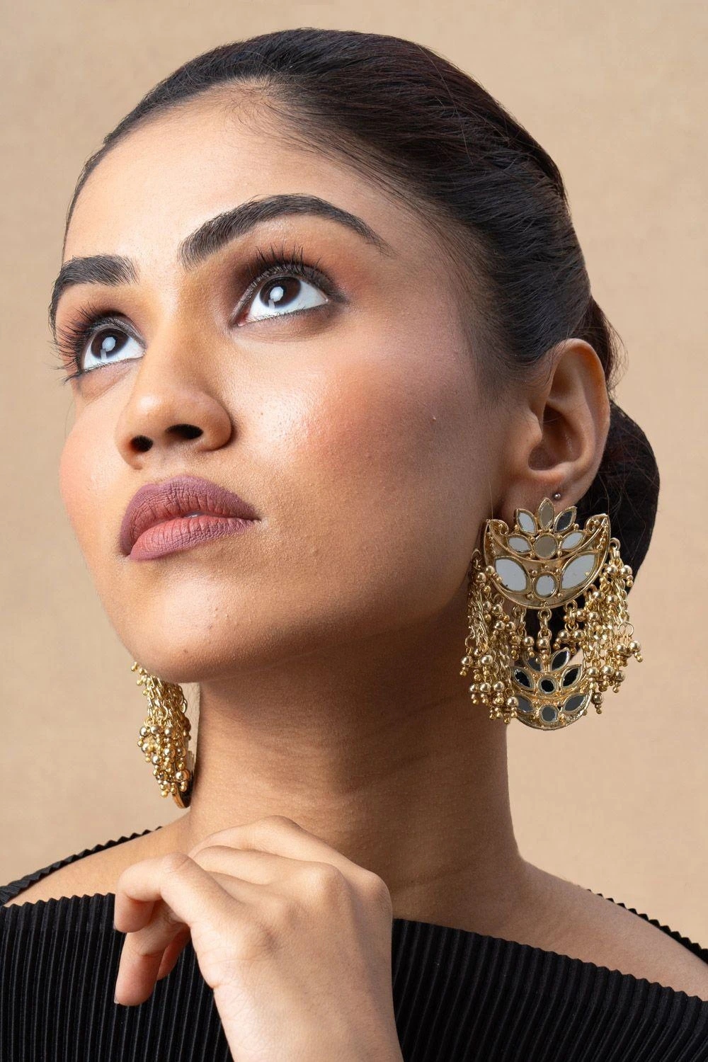 Adorn yourself with the elegance of these Lotus Studded Danglers. Intricate lotus motifs, studded with exquisite detail, dangle gracefully from these earrings. The radiant gold shines with a celestial allure, embodying timeless beauty.
