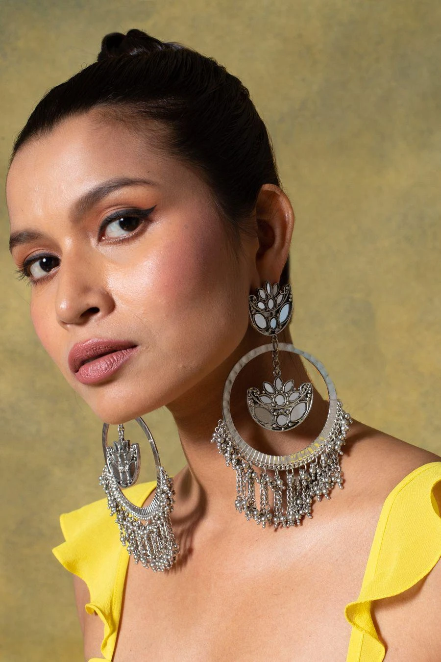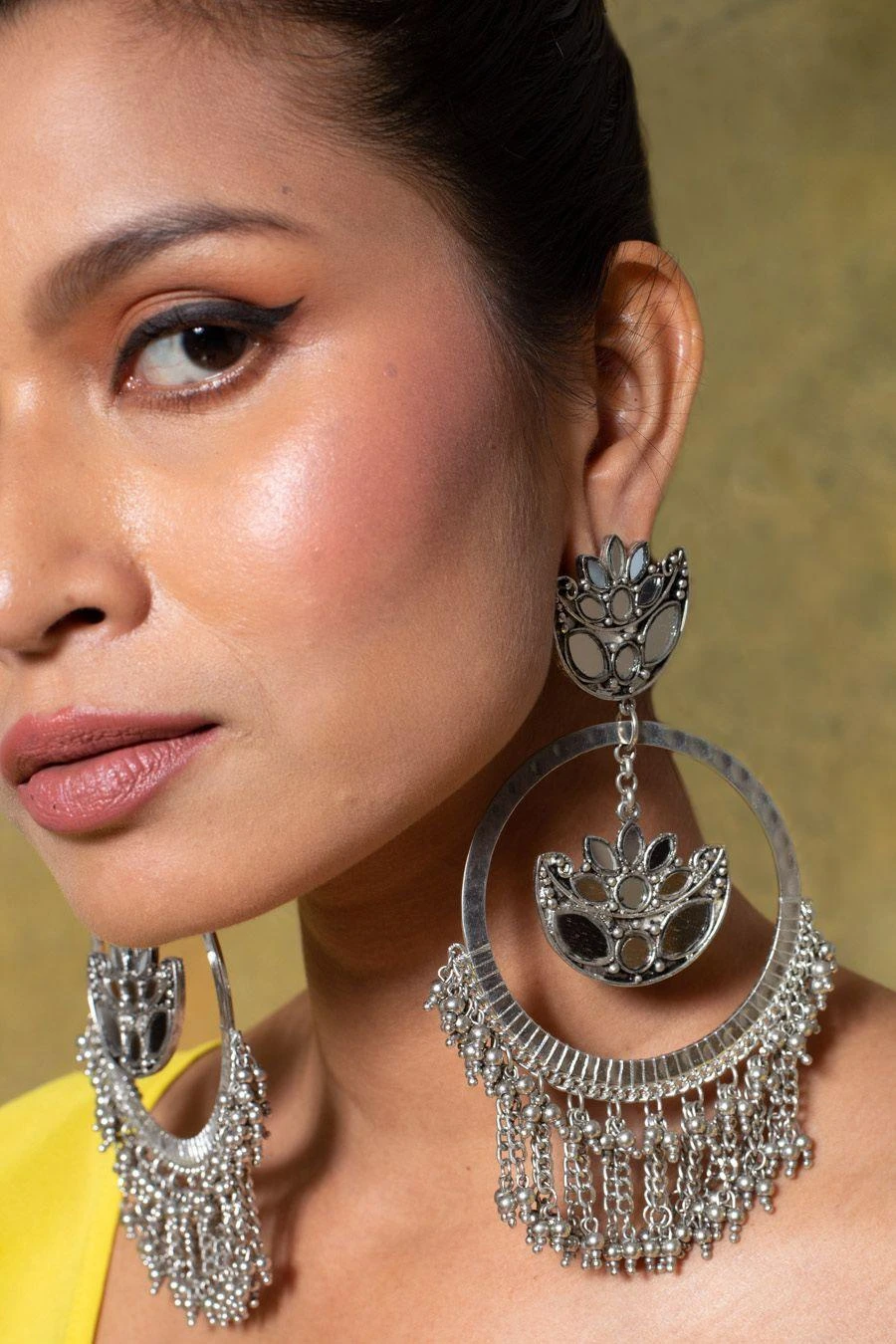 These gorgeous earrings are a true work of art, crafted with intricate mirror work and delicate detailing that exude an air of elegance and sophistication.