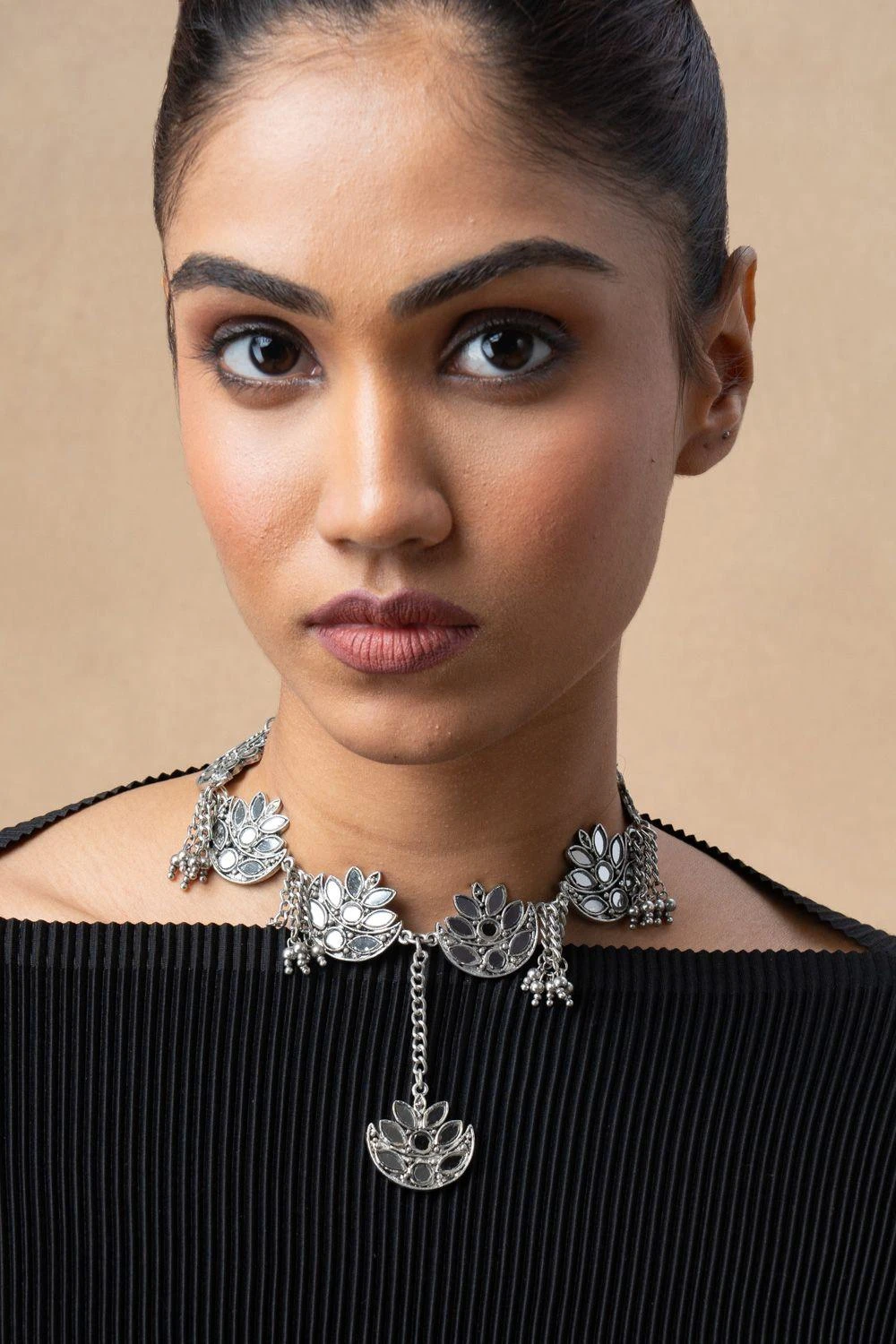 Adorn your neck with the ethereal elegance of this Silver Floral Choker. Delicate blooms intertwine, crafted with meticulous detail, creating a mesmerizing piece. The radiant silver reflects light, enhancing your allure.