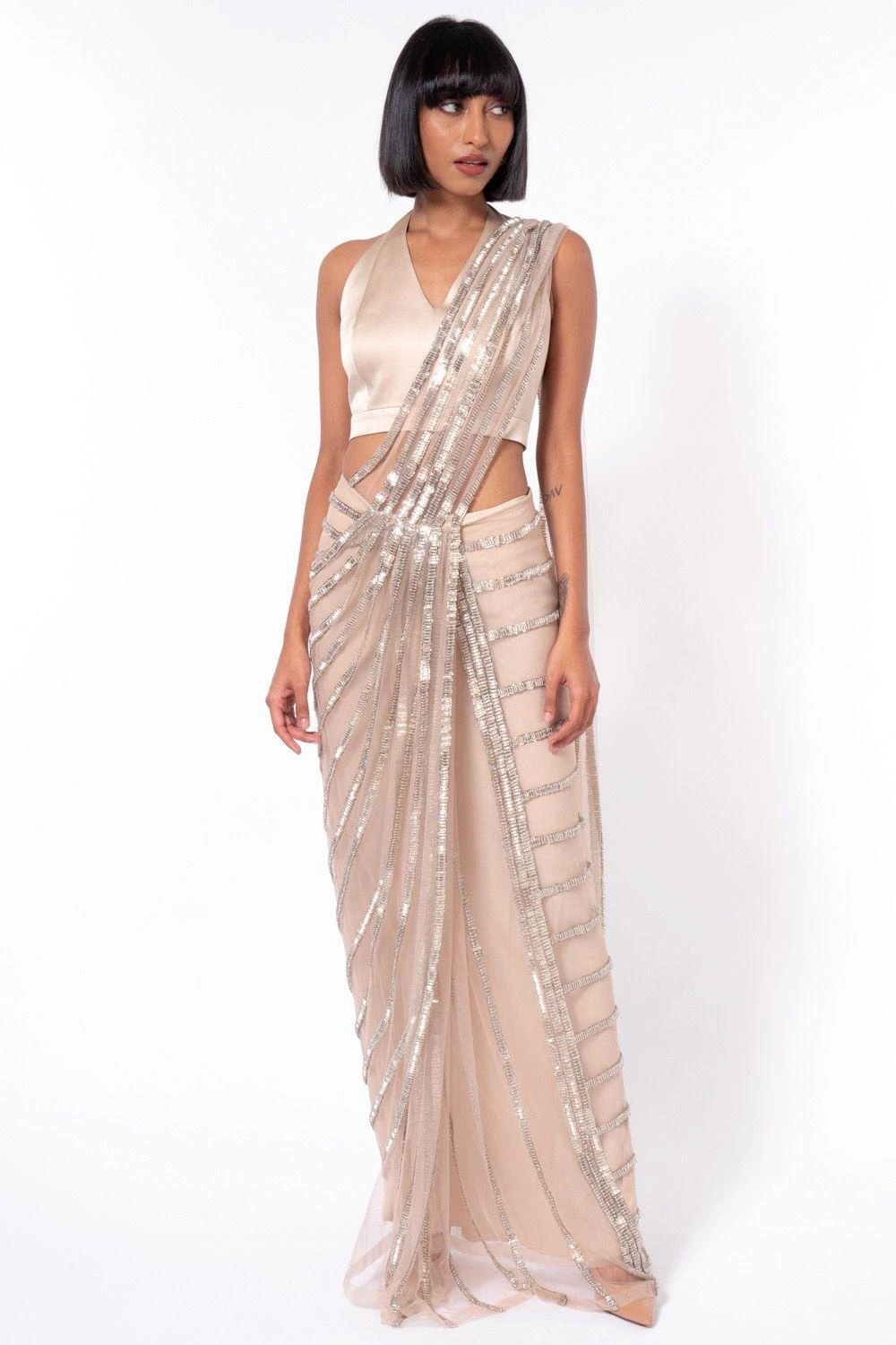 This sari will make great investments in your closet this Diwali & beyond. It features crystal embellishements & is complimented with an equally versatile blouse. Style this set with a pair of statement earrings & a clutch to complete the look.