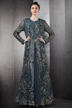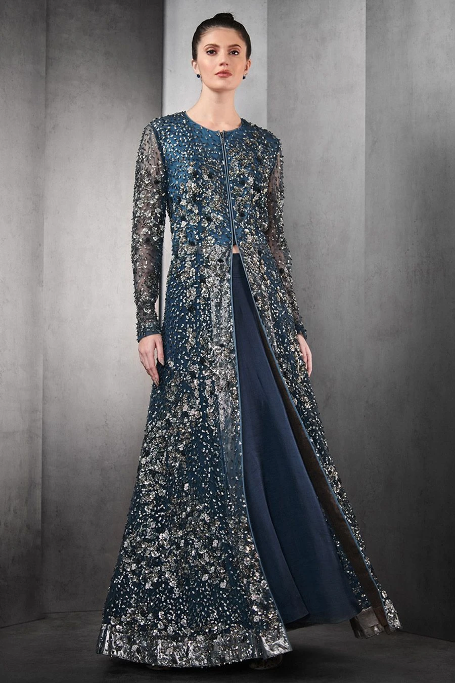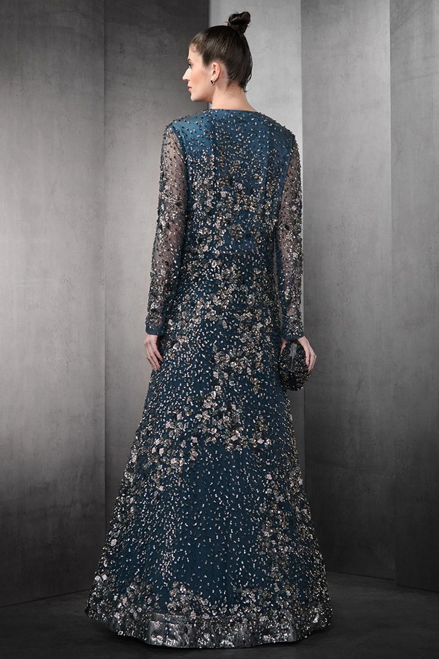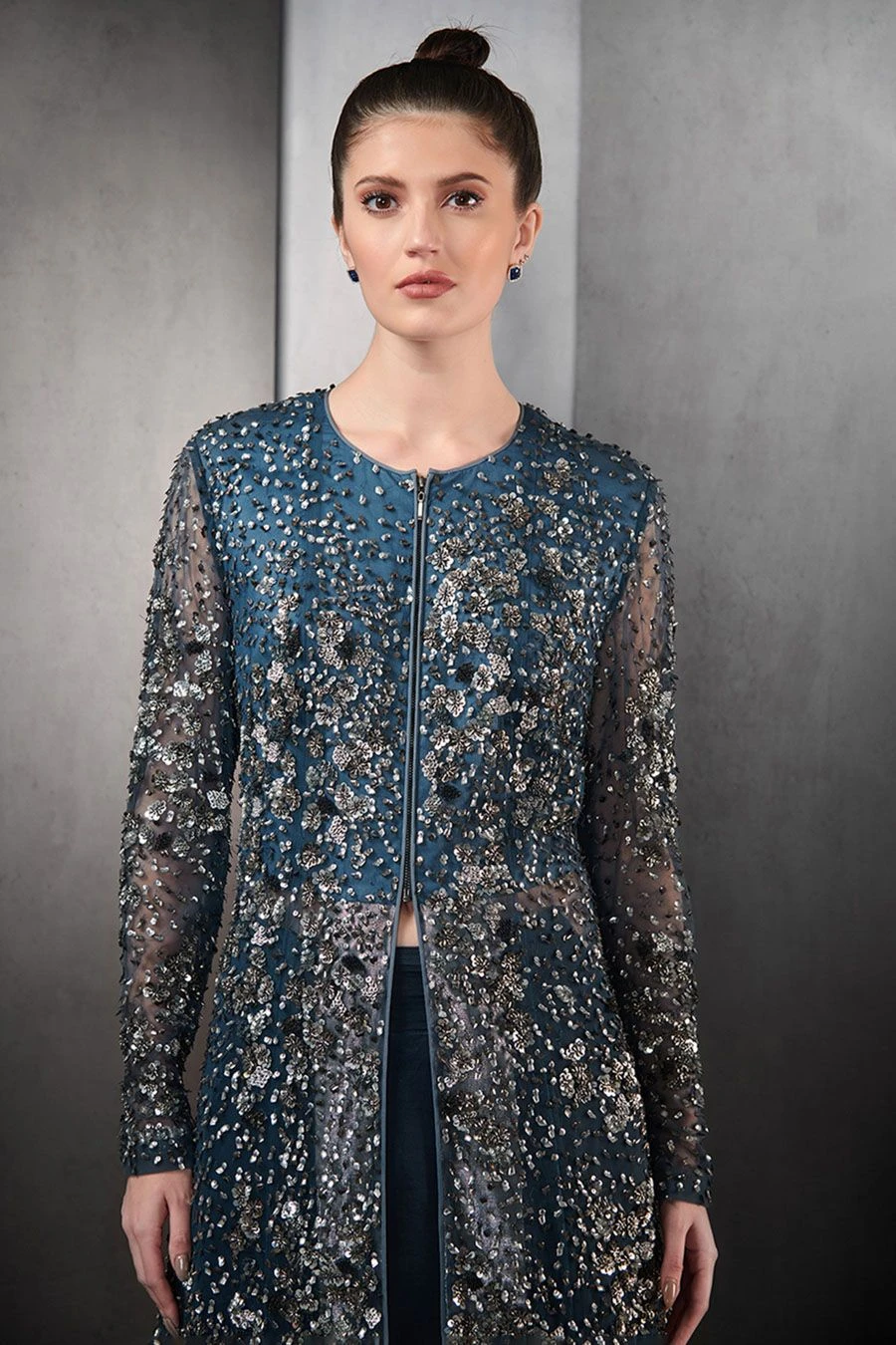 With the right amount of shimmer and sparkle, this jacket set is an apt choice for an evening celebration. Crafted in nylon polyester, this set features a sequin embellished long jacket with a pair of trousers.