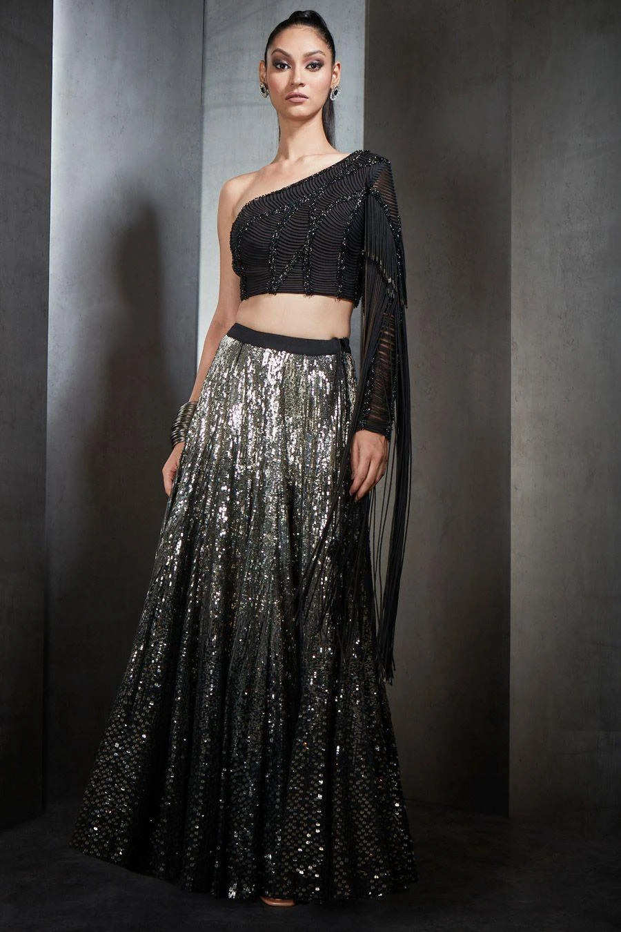 If you’re looking for a head-turning statement-making top this is the outfit for you. Crafted in tulle and net, this handcrafted fringe one shoulder crop top has metallic and tonal embellishments.