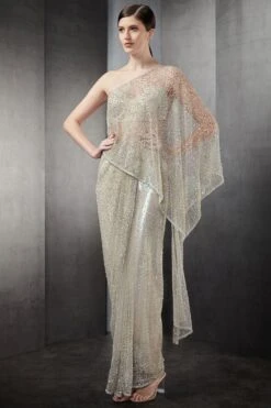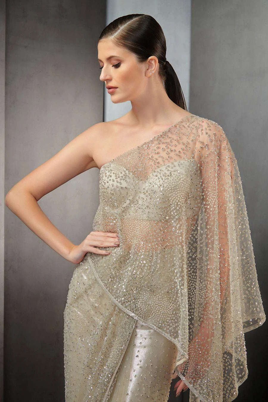 If you’re looking for a head-turning statement-making gown, this is the dress for you. Crafted in tulle, this one shoulder, sari gown features sequin embellishments. Add a pair of statement earrings to complete the look.