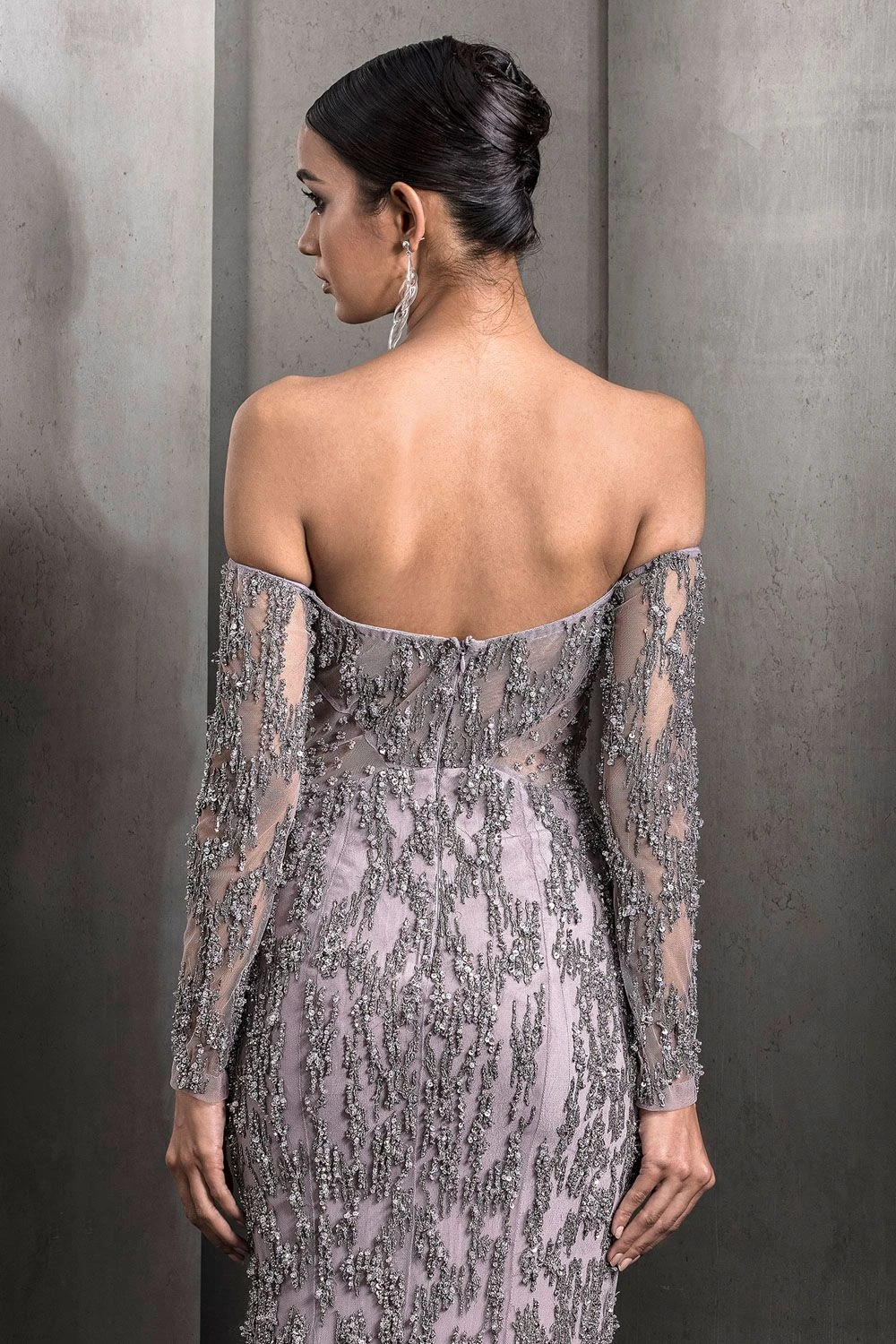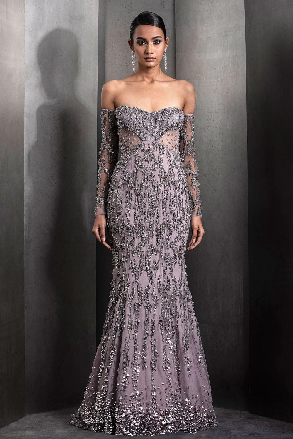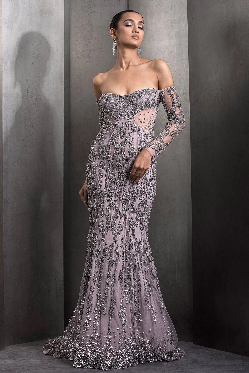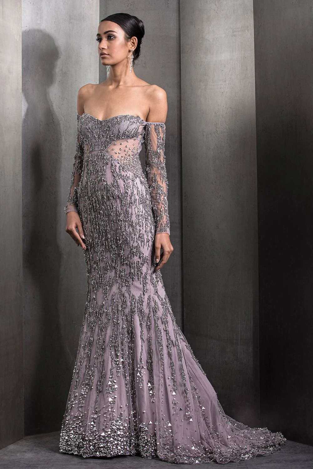 Discover elegance in this ensemble, adorned with delicate crystal hangings, intricate hand embellishments, cutwork embroidery and metallic accentsùa symphony of opulence and craftsmanship.