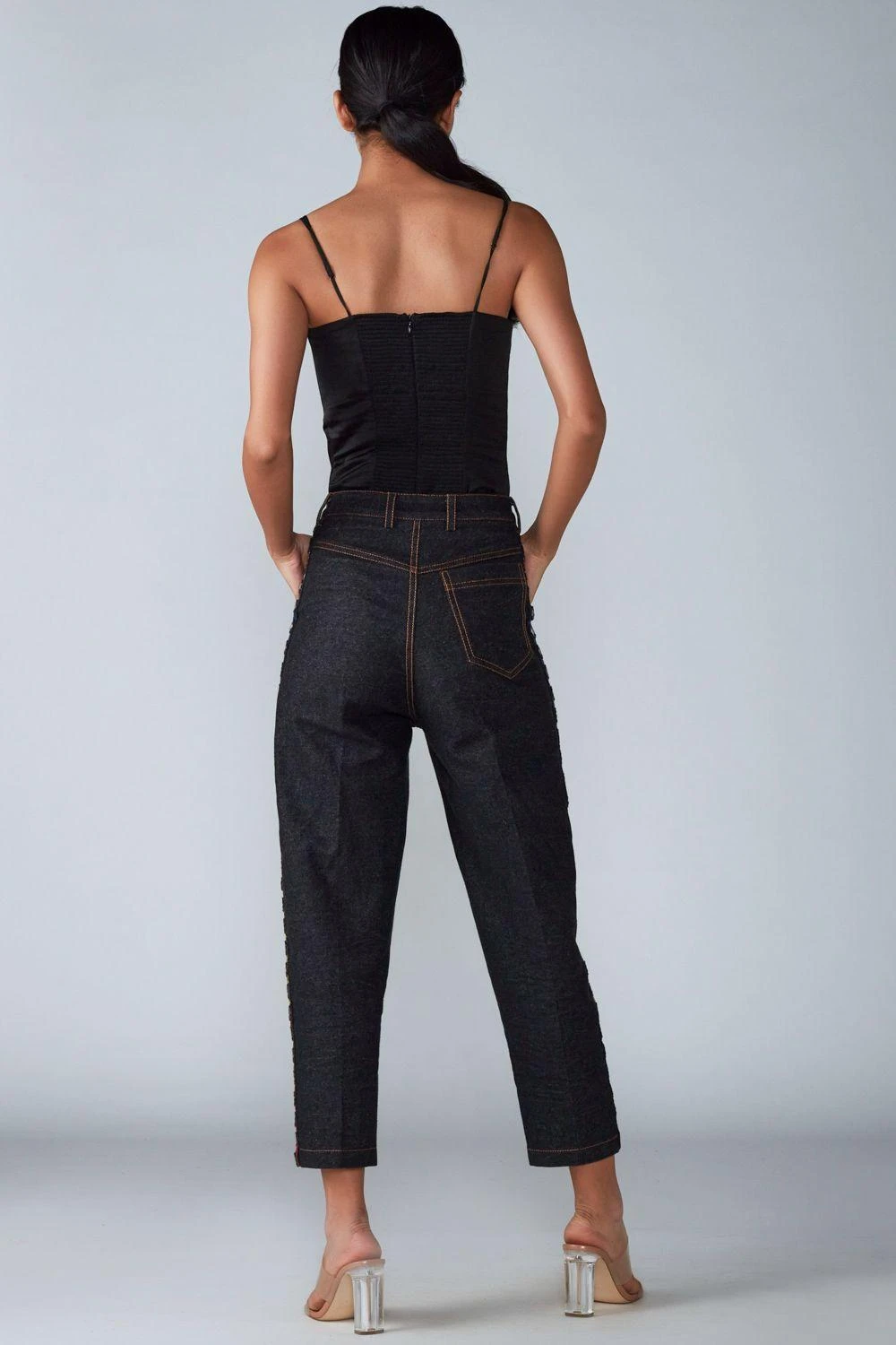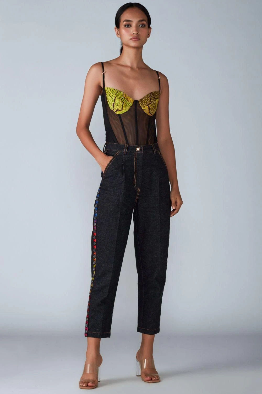 This black & yellow bodysuit cut in satin & net is brought alive with corseted bodice & tile print. It also comes with adjustable straps. Style this exquisite piece with a pair of acid washed denim jeans from the collection to complete the set.