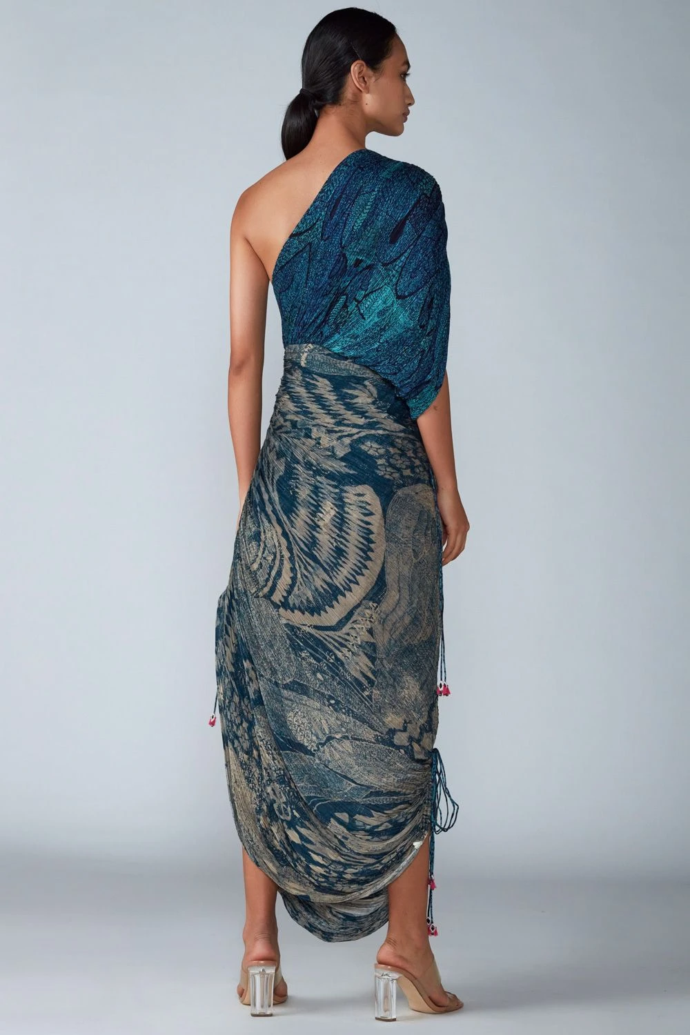 Saaksha & Kinni gives a fresh & youthful spin to the sari silhouette with this avant-garde curation. This micro pleated one shoulder sari dress is engineered in cotton silk with an abstract bird & tile print.