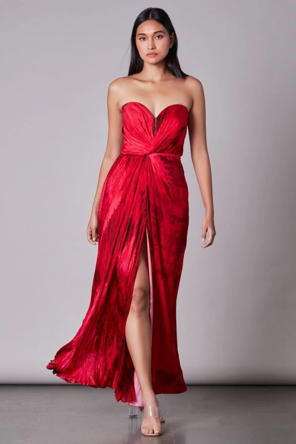 This electric cherry maxi dress is all things chic & fiery. This gown has been tailored with a sweetheart neckline and a thigh high slit in part chiffon, part satin and enhanced with hand micro pleating. You can add a layered necklace with this look.
