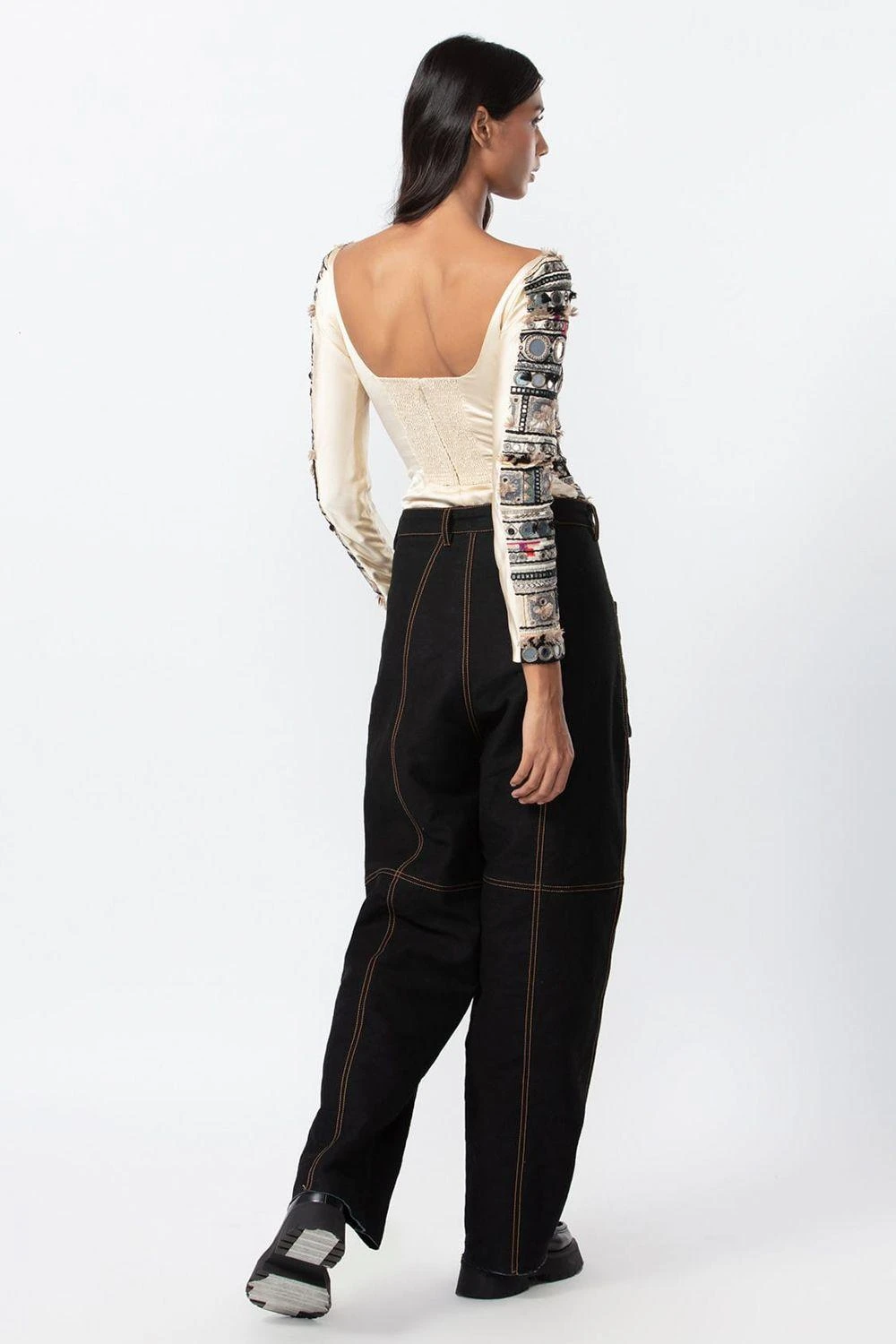 Step into style with this bodysuit adorned in intricate mirror, thread, and metal hand-embroidered detailing. A contemporary masterpiece that exudes individuality and captures attention.