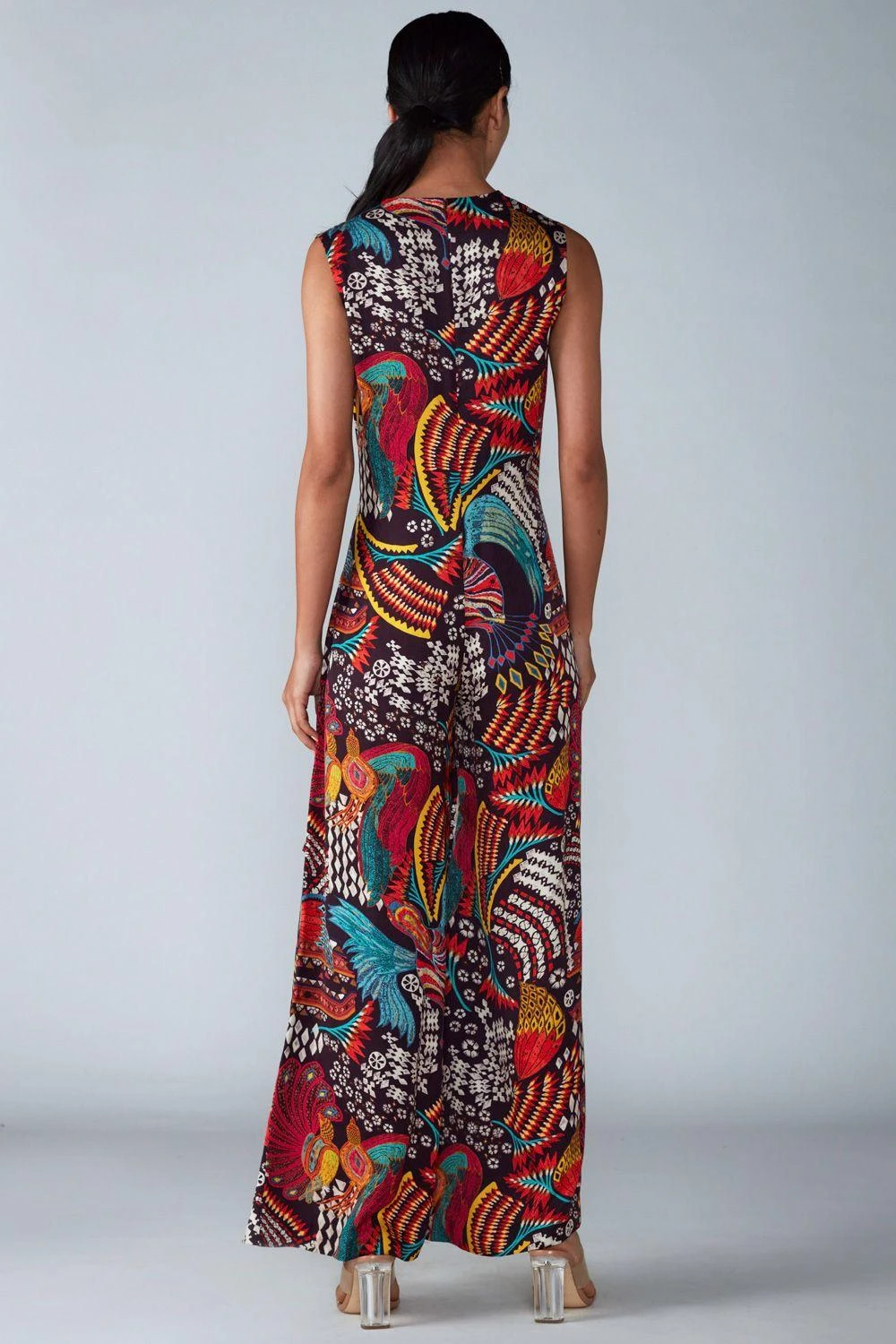 Add a layer of glamour and statement style to resort getaways with this abstract printed jumpsuit. Crafted in satin, this jumpsuit features a bird print with an attached belt. Style it with a pair of statement earrings to complete the look.