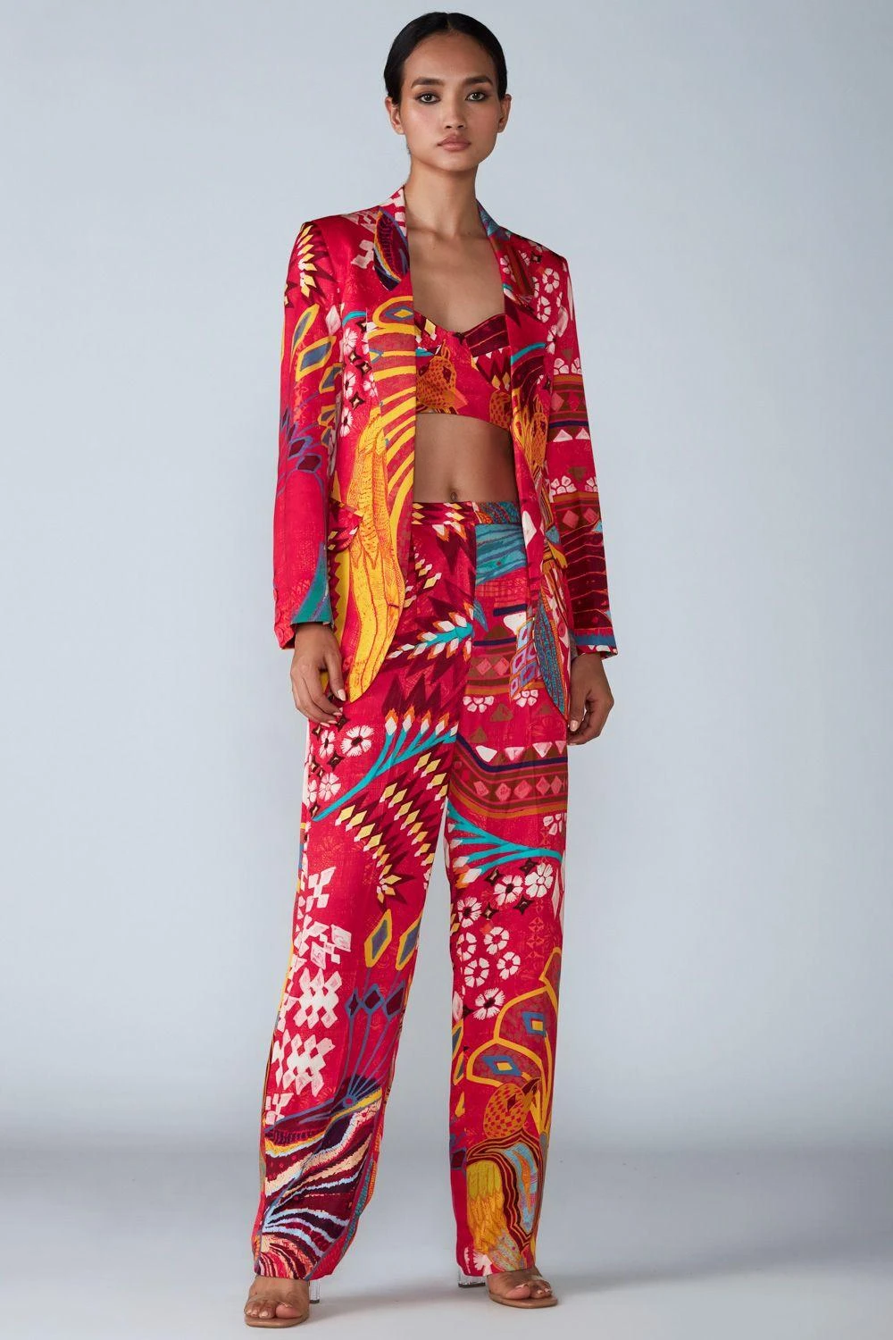 Crafted in satin, these trousers feature an abstract bird print all over. Style these pants with the pink avian printed blazer & bustier to complete the set.