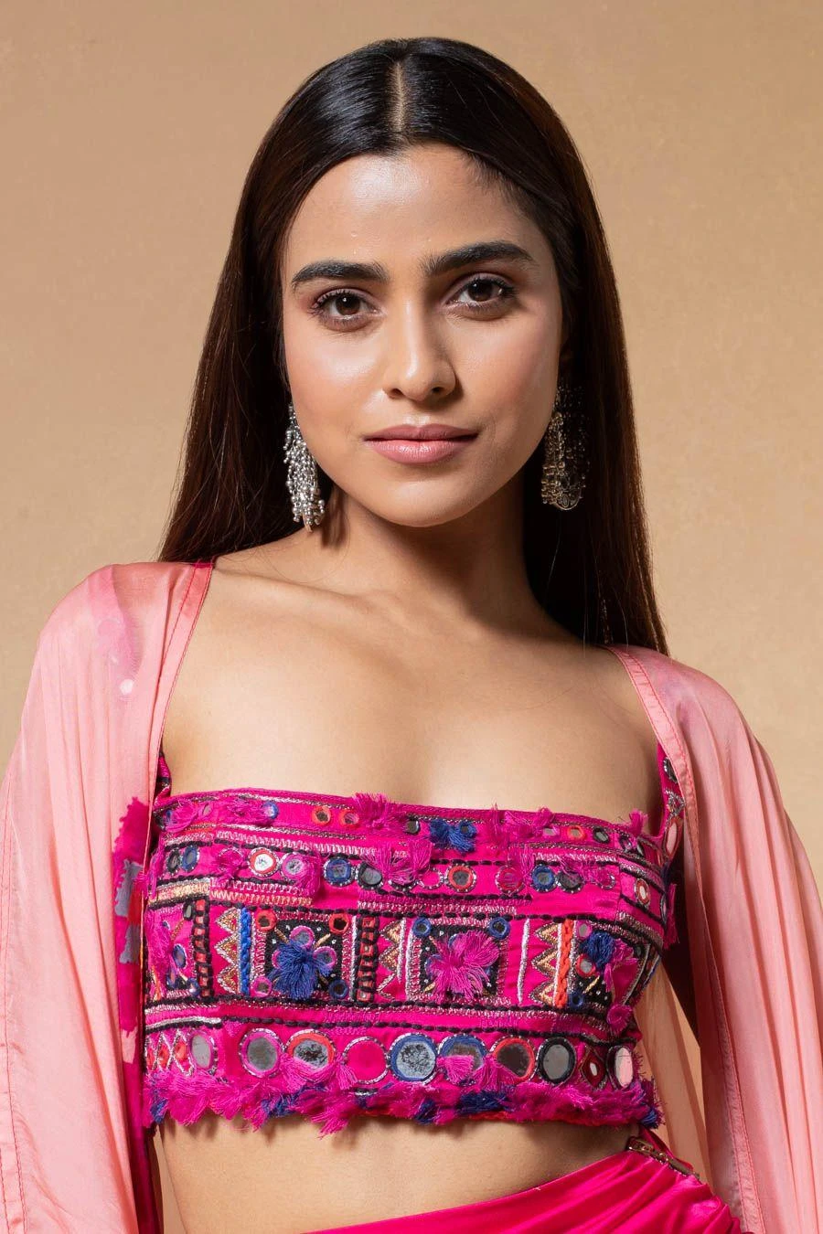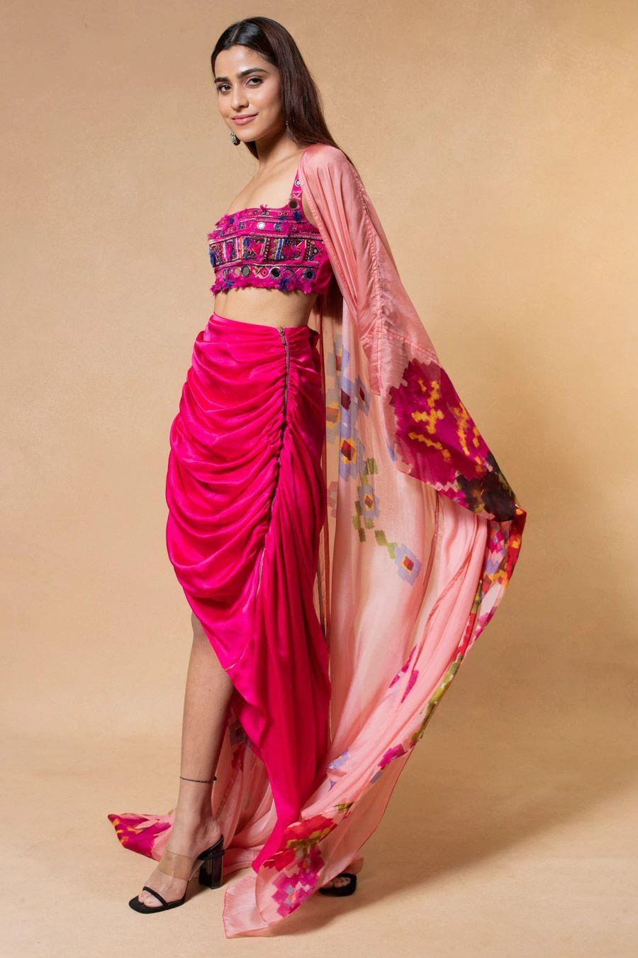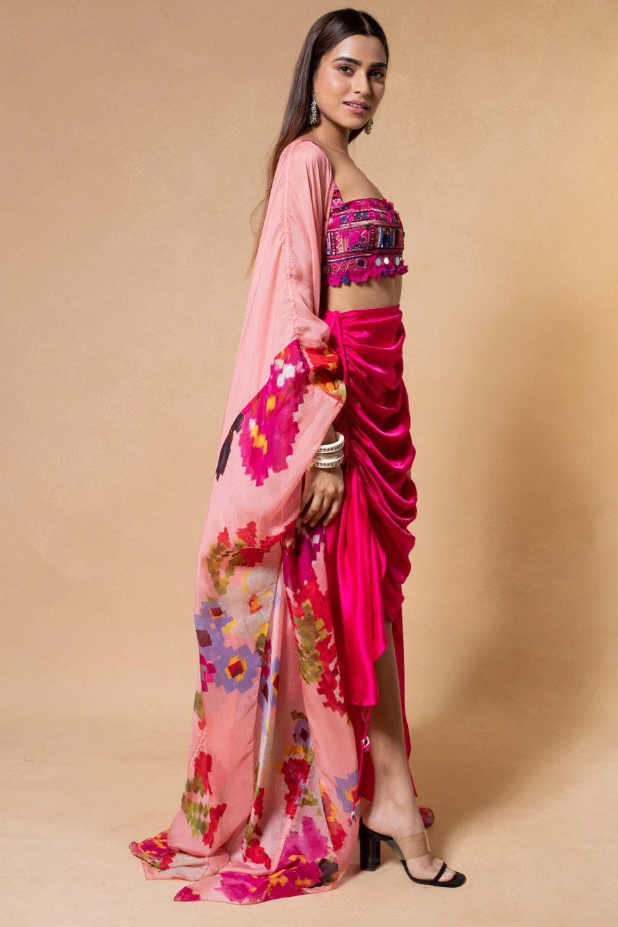 Look effortlessly stylish with this cape set. Crafted in chiffon & silk, this set features an abstract floral printed cape paired with a square cut mirror embellished bustier & a draped asymmetric skirt.