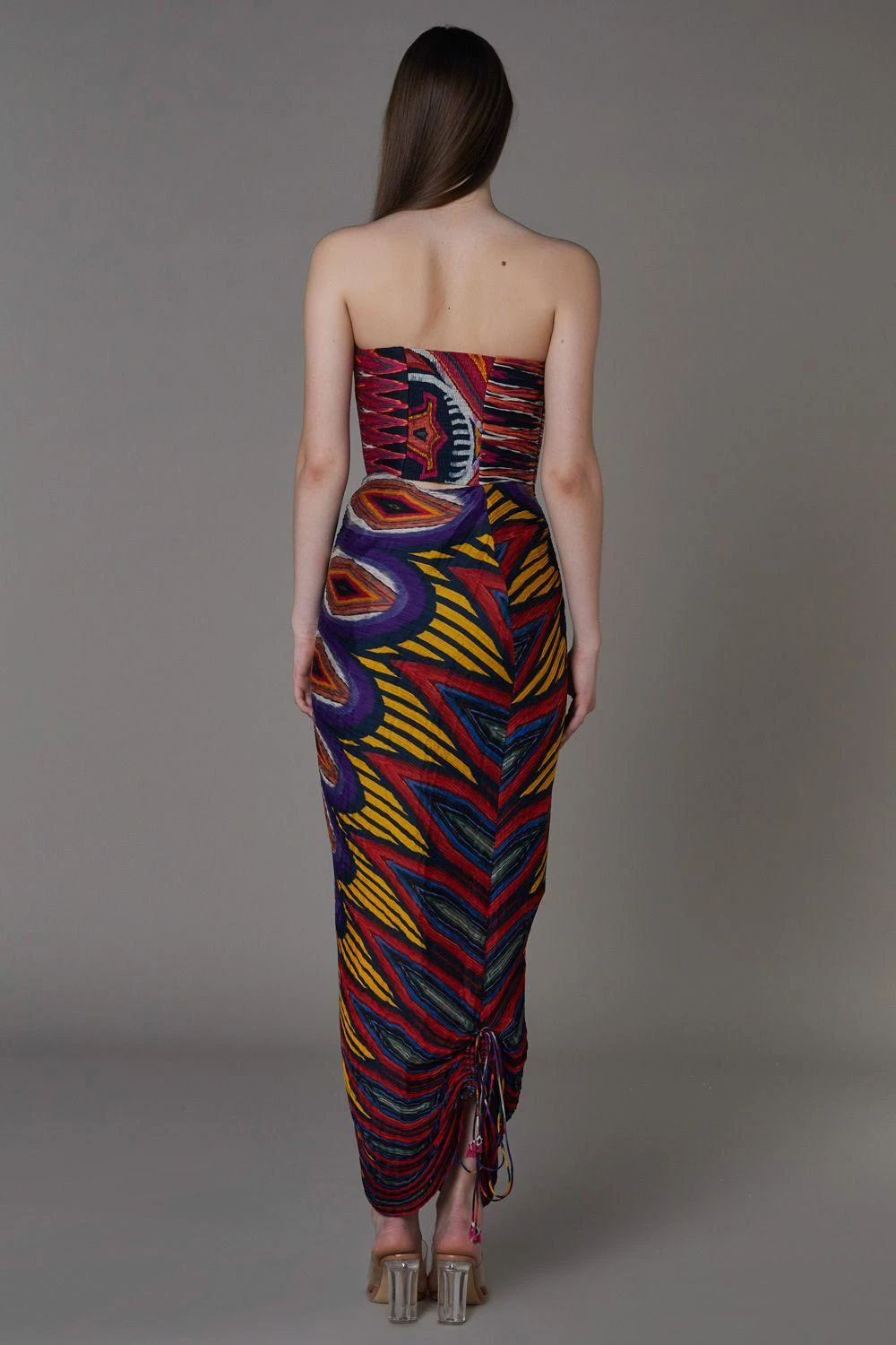 This one of a kind abstract print corset style sari dress is set in Saaksha & Kinni’s signature hand micro pleated fabric. This statement piece can be styled with oversized studs & a clutch for an evening soiree.