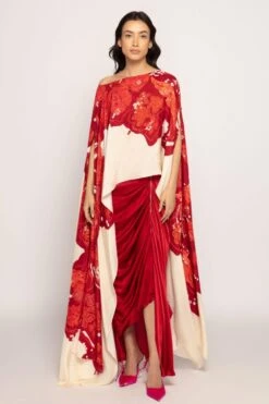 Indulge in the elegance of this Periwinkle Bandhani Placement Print High Neck Kaftan Style Cape paired with a stylish Draped Asymmetric Skirt featuring intricate zipper detailing. A fusion of grace and contemporary design for your sophisticated look.