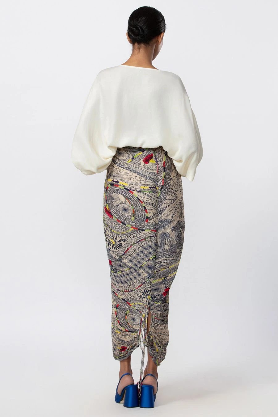 This co-ord set falls in the realm of luxe minimalism. Crafted in silk & cotton silk, this set features a batwing sleeve, an abstract floral printed blouse with intricate thread & mirror embellished details paired with a blue micro pleated skirt.