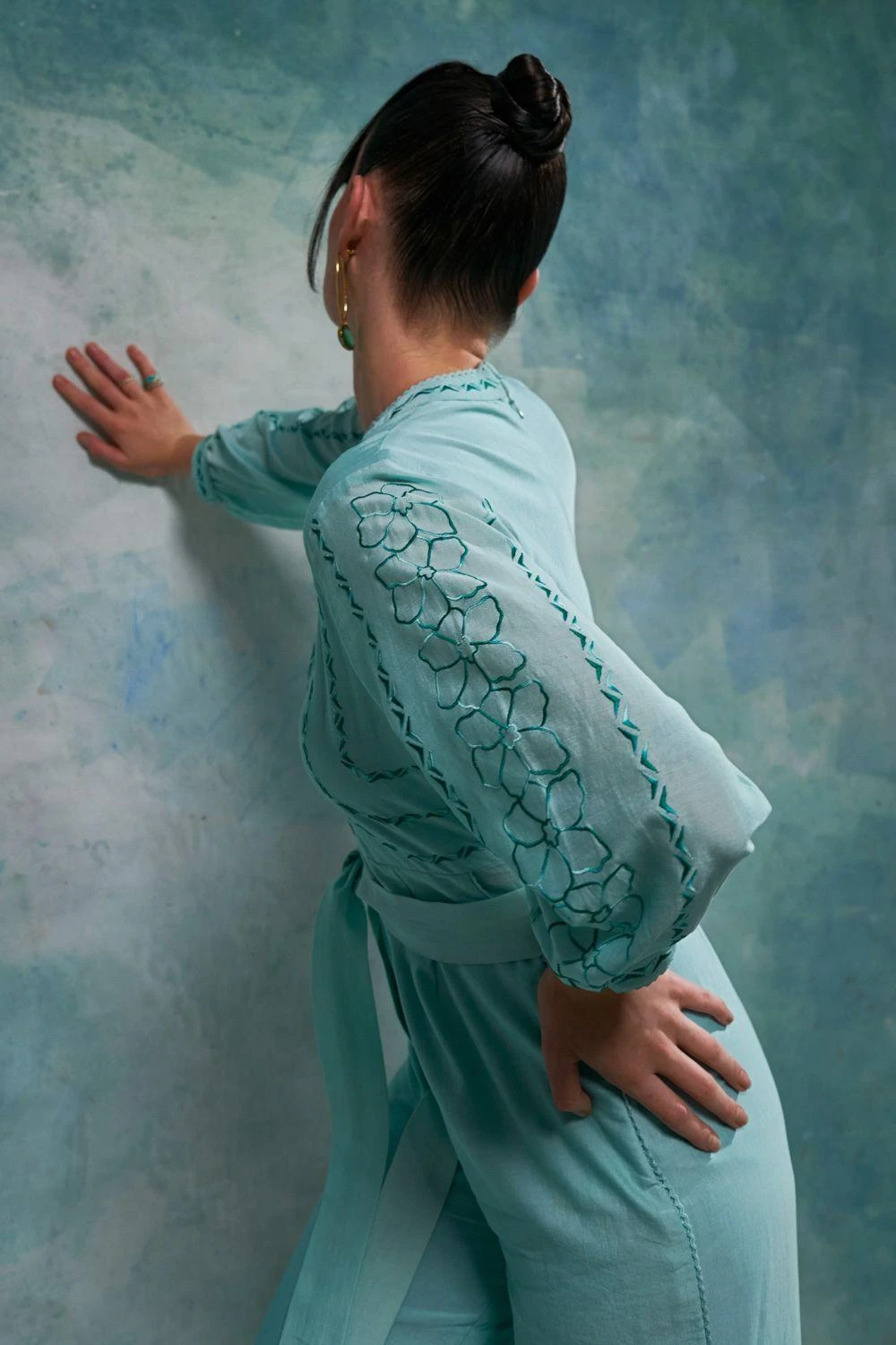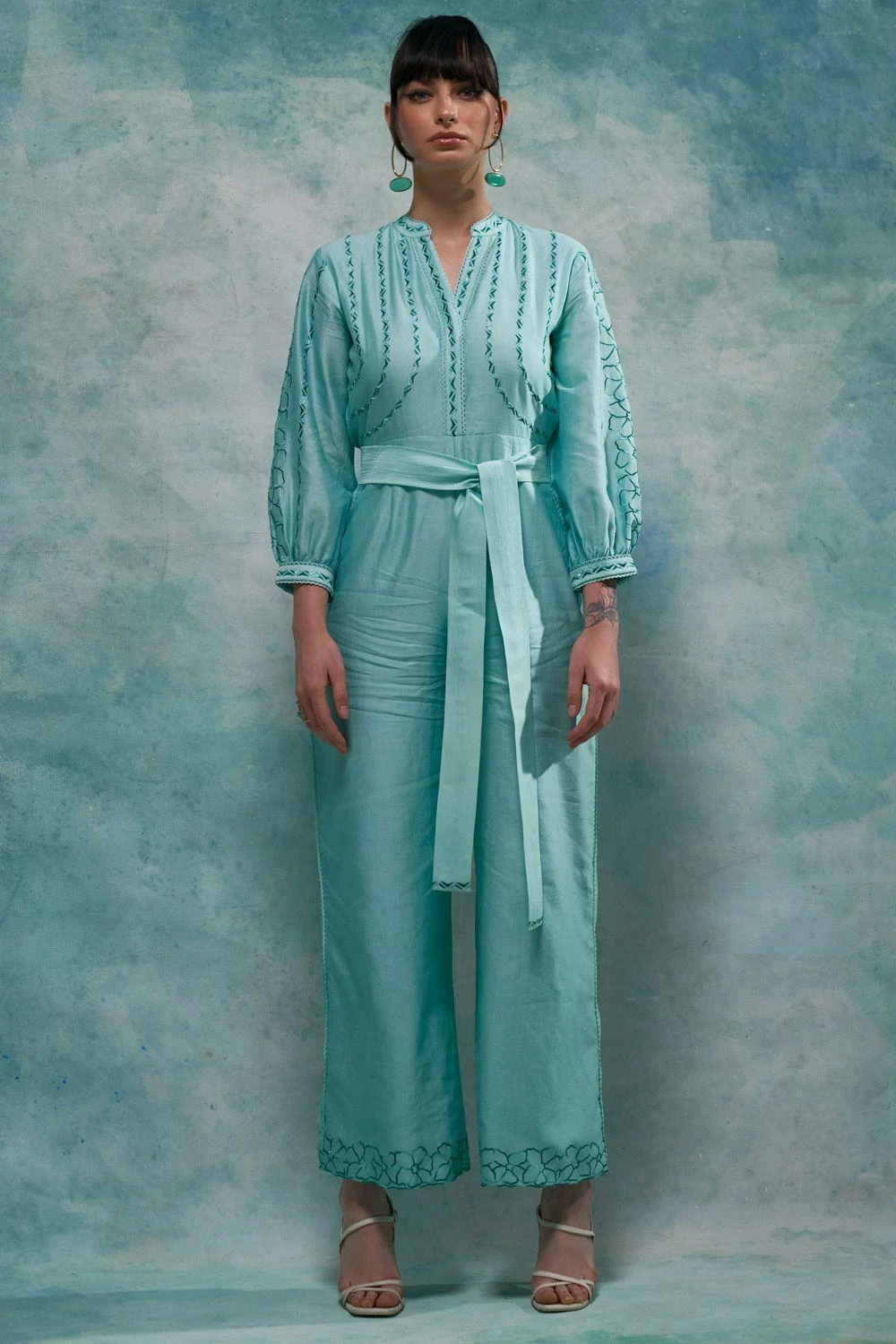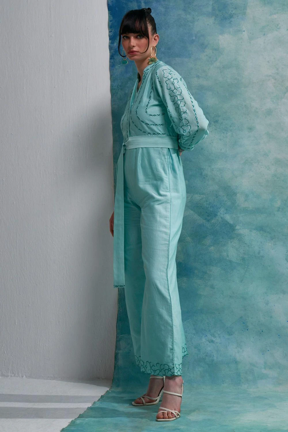 Indulge in the elegance of this V-neck band jumpsuit featuring exquisite embroidery and delicate lace detailing. The design extends to the front & sleeves, while the wide-leg bottom boasts intricate embroidery & lace with a side slit for added charm.