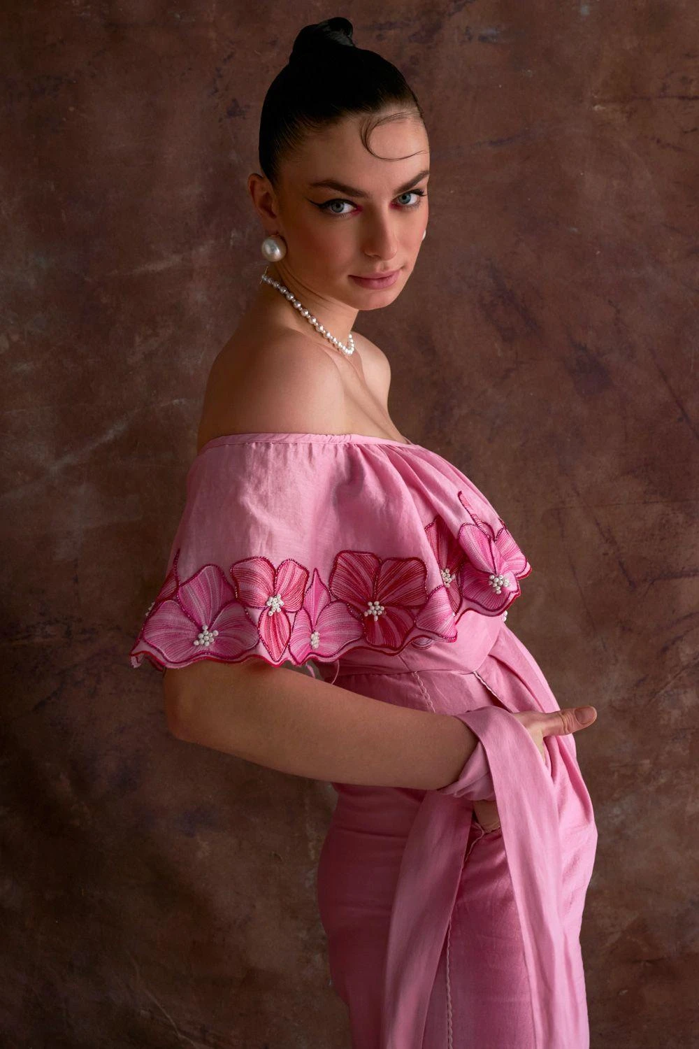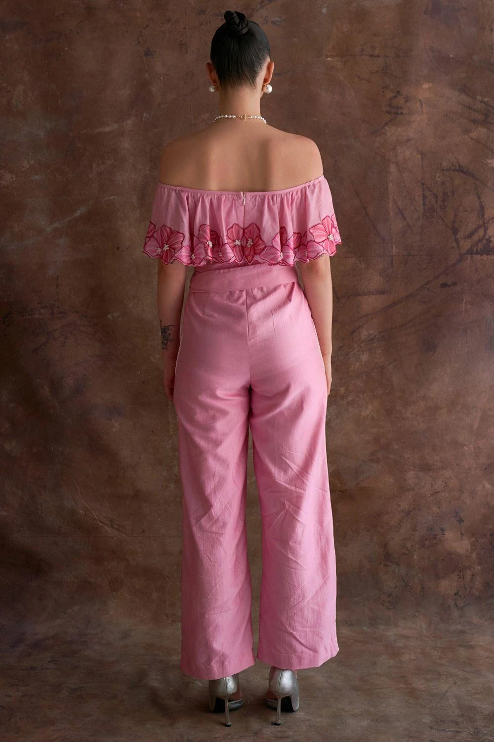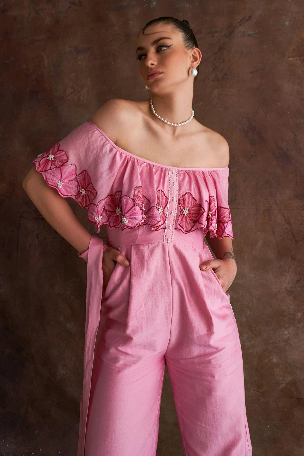 Step into elegance with this off-shoulder jumpsuit adorned with intricate embroidery, pearls & lace detailing. This piece features a back zipper, convenient pockets & a belt to accentuate your waist.