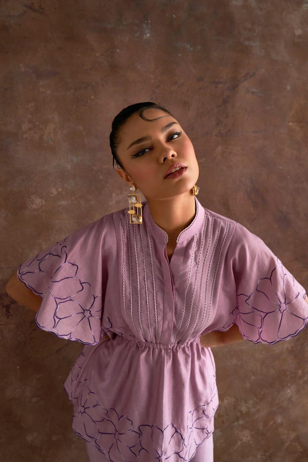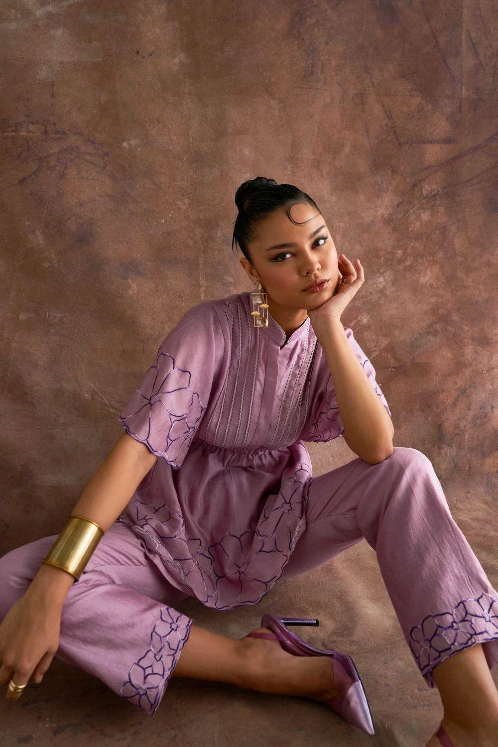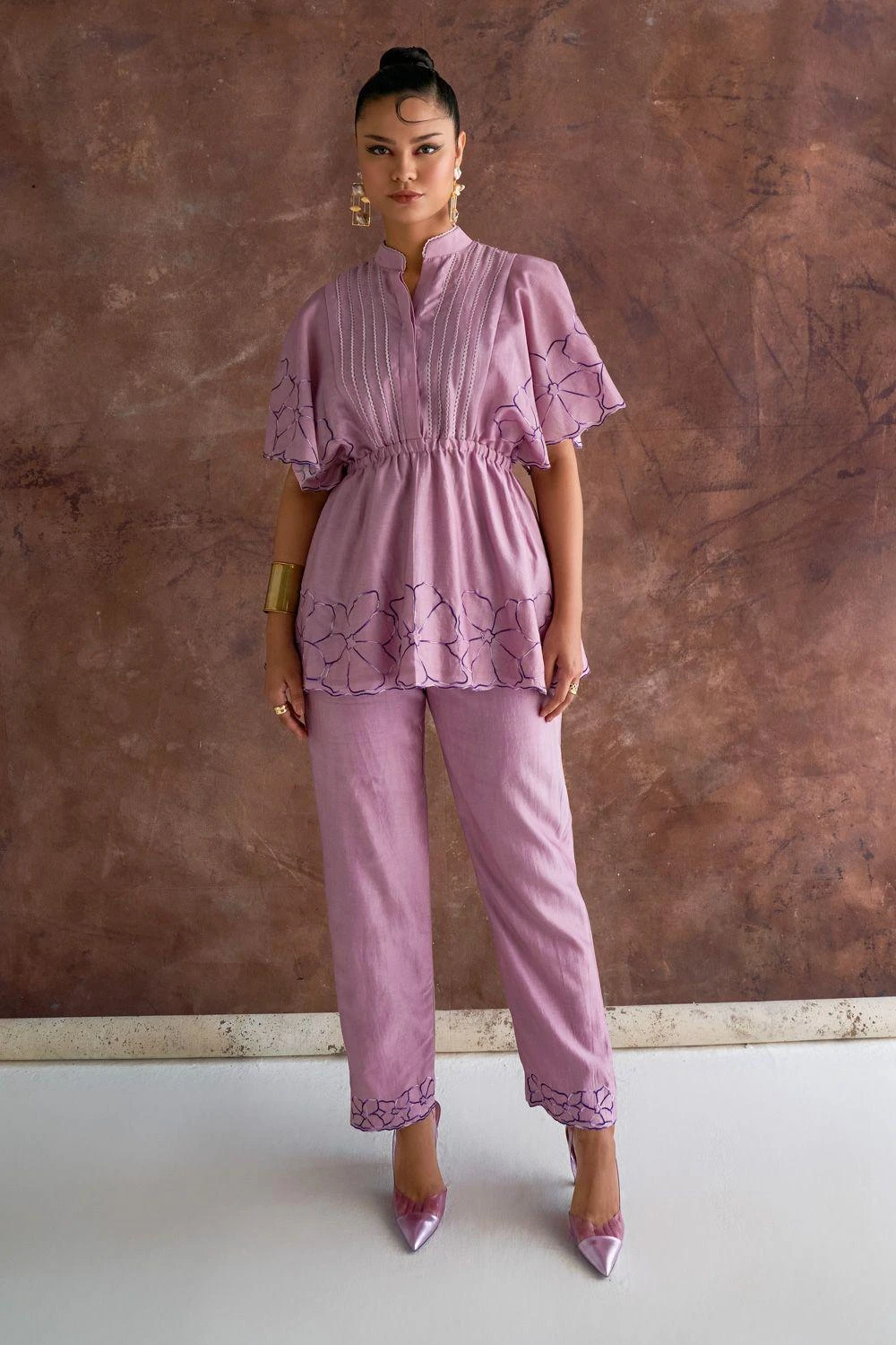 In a tale spun with luxury, embrace a top adorned in embroidered floral elegance along its sleeves & hem enriched with a lace-detailed center panel. Its perfect partner awaits: embroidered straight pants, an embodiment of sophistication.
