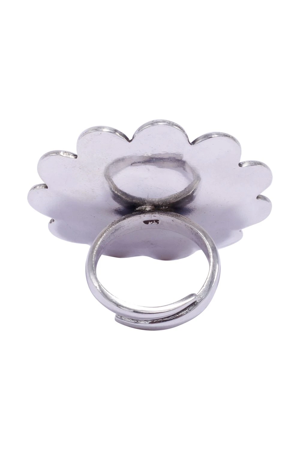 Radiate elegance with this intricate floral tribal silver ring. Handcrafted to perfection, this piece embodies timeless sophistication, adding a touch of allure to your style.