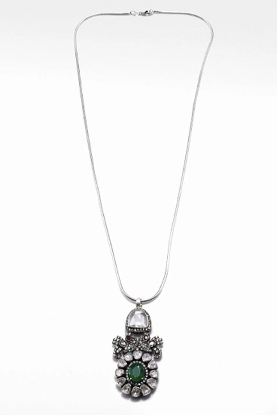 This chic handcrafted silver necklace is the perfect accessory to style with your daytime looks. This silver necklace is crafted with peacock motifs and studded with moissanite gemstones and green onyx.