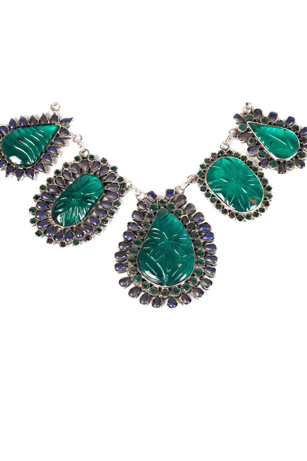 Take your festive look a notch higher with this magnificent emerald stone necklace. Handcrafted in silver, this necklace is encrusted with significant emerald & blue stones. Adorn it with an ivory anarkali or sari for a splendid look.