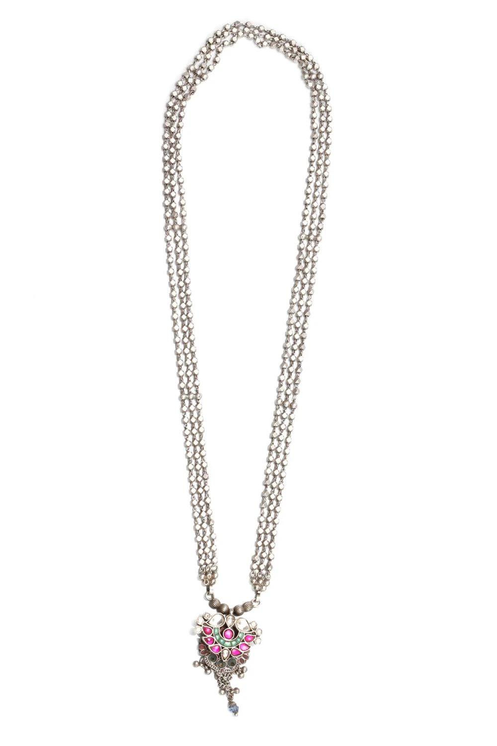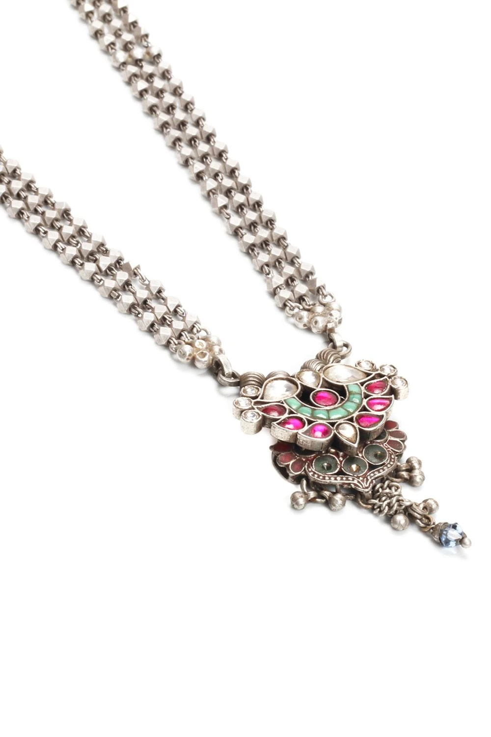 This handcrafted silver necklace is studded with kundan, emeralds & pink semi precious stones. Style this long necklace with a sari or kurta set to accessorise your look.