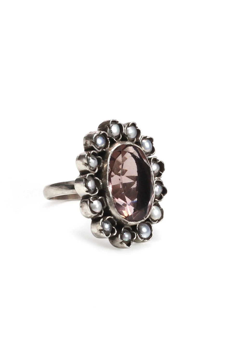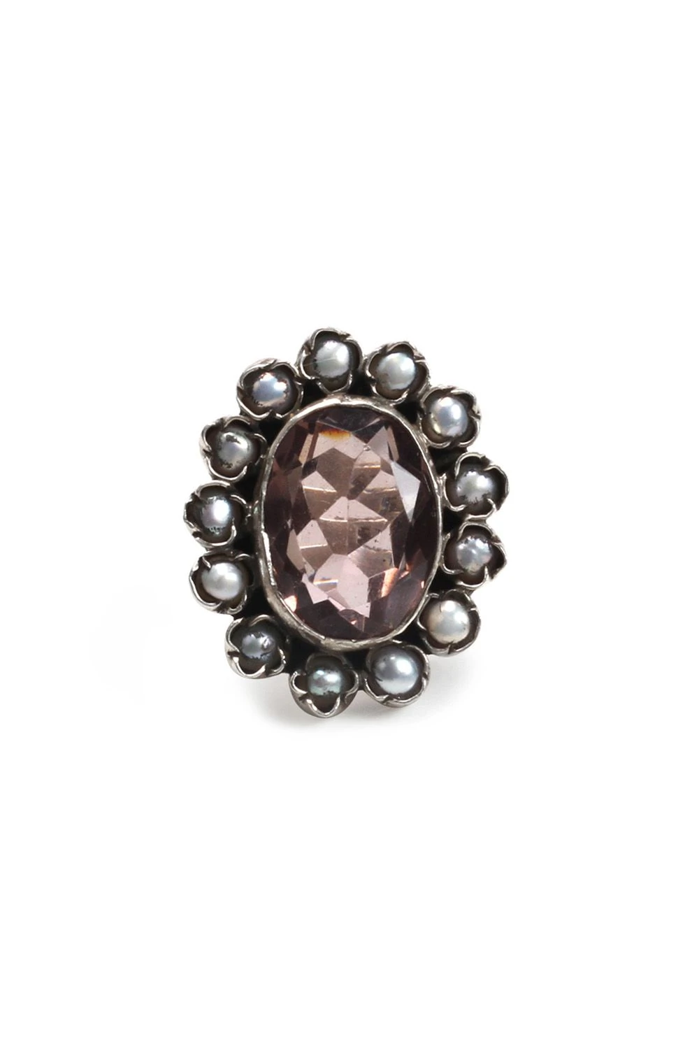 This oval shaped silver ring is handcrafted in silver, encrusted with a sparkling gem stone encircled with tiny pearls, which catches the attention. Style it with your contemporary looks for a vintage touch.