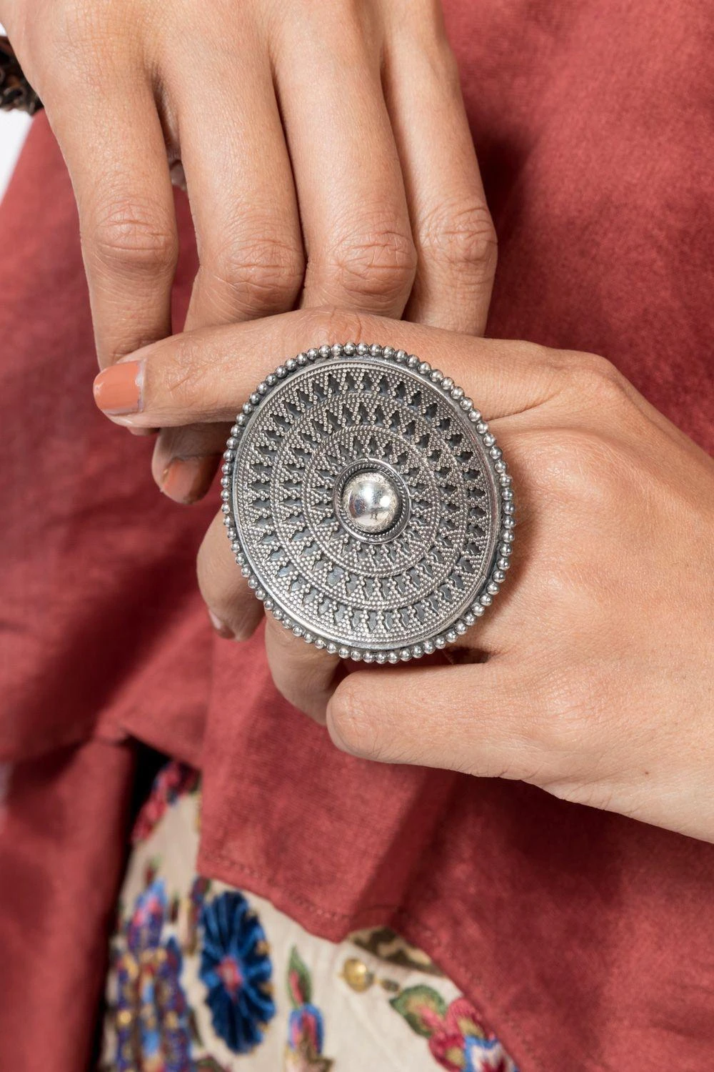 A statement accessory can instantly uplift your looks and this ring is no exception. It is handcrafted in silver in a circular structure with a center stone detail.