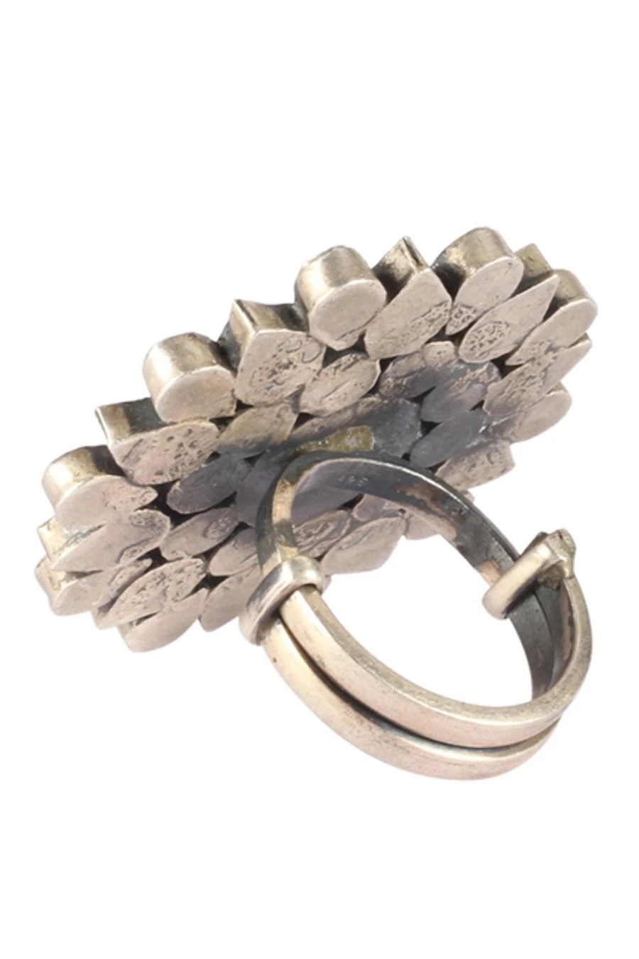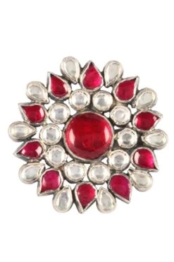 This chic handcrafted silver ring is the perfect accessory to style with your daytime looks. While demonstrating exceptional craftsmanship, this silver ring is studded with white and red kundan motifs