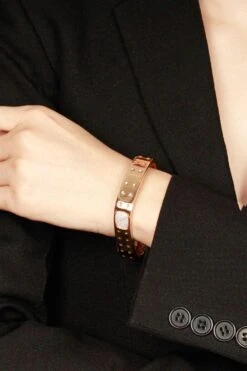 Crafted with precision, this breathtaking diamond-studded bracelet shines in 24K rose gold plating, a masterpiece by skilled artisans for your elegance.